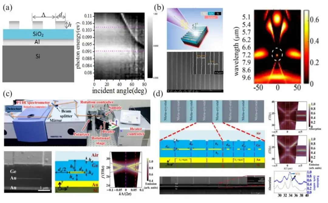 图3 热辐射角度响应机制与角分辨热辐射光谱测量技术。(a)Al/SiO2/Al超表面结构示意图以及测量得到的不同偏振下随角度变化的热辐射谱;(b)Al/SiN/Al 超表面结构示意图以及测量的空间孤立的热辐射图;(c)角分辨热辐射光谱测量装置示意图以及设计的超晶格示意图和该结构下测量和计算的热辐射色散;(d)设计的超晶格示意图和测量与计算的热辐射色散,证明了界面态的存在。