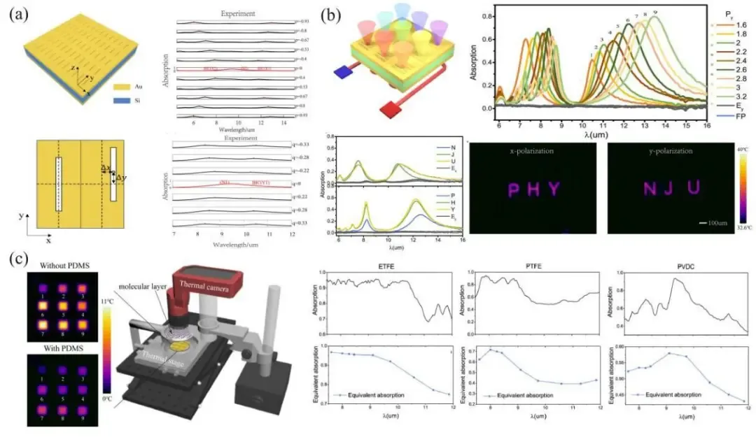 图4 热辐射芯片的发展。(a)纳米孔结构示意图及不同不对称参数下的吸收谱;(b)热辐射芯片示意图及其辐射谱和不同偏振下纳米孔图案的热像图;(c)热辐射芯片成像装置和ETFE、PTFE、PVDC材料的等效吸收光谱。