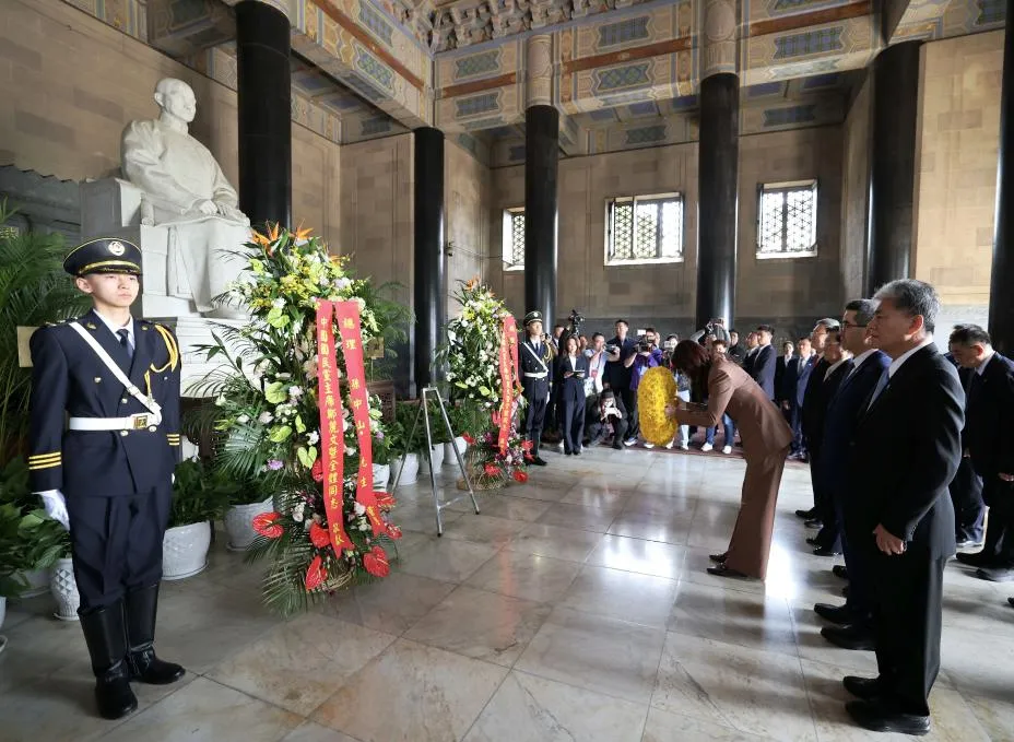 祭堂内,气氛庄重。面对孙中山先生的石刻坐像,郑丽文携国民党副主席李乾龙、张荣恭、萧旭岑等人静默肃立。在司仪宣读祭文后,郑丽文敬献黄色花环,全体成员行三鞠躬礼并默哀。祭文强调“吾党诸卿,团结一同……共创和平,宝岛神州”,表达了对传承孙中山先生遗志、促进两岸和平的期许。随后,一行人进入墓室,凭吊孙中山先生棺椁。