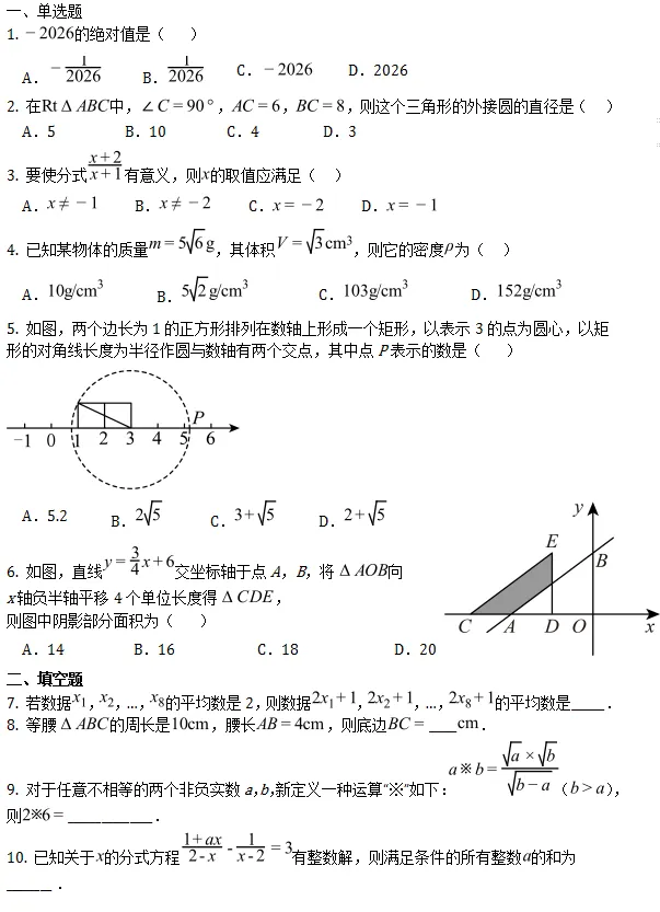 【2026年人大附中西山学校中考零模数学卷】