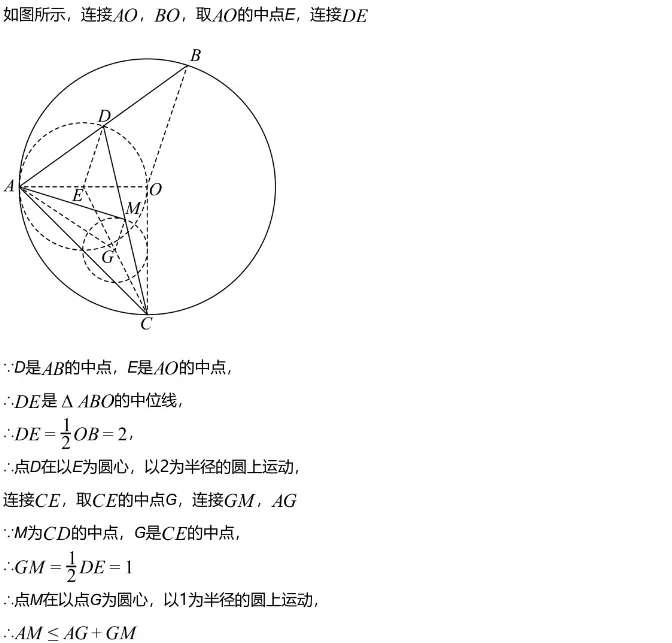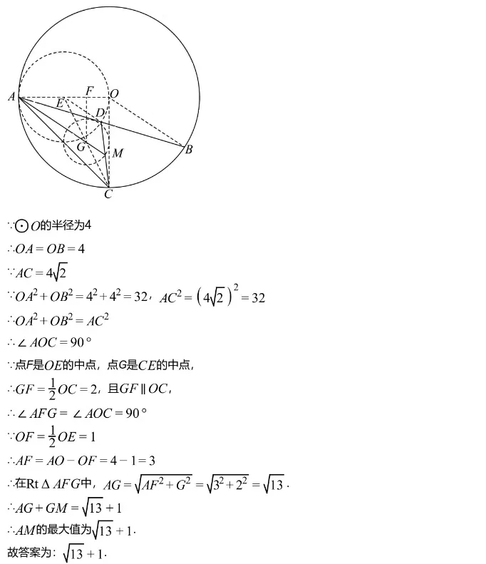 ∴如图所示,当点A,G,M三点共线时,AM取得最大值,即AG+GM的长度,取线段OE的中点F,连接GF,