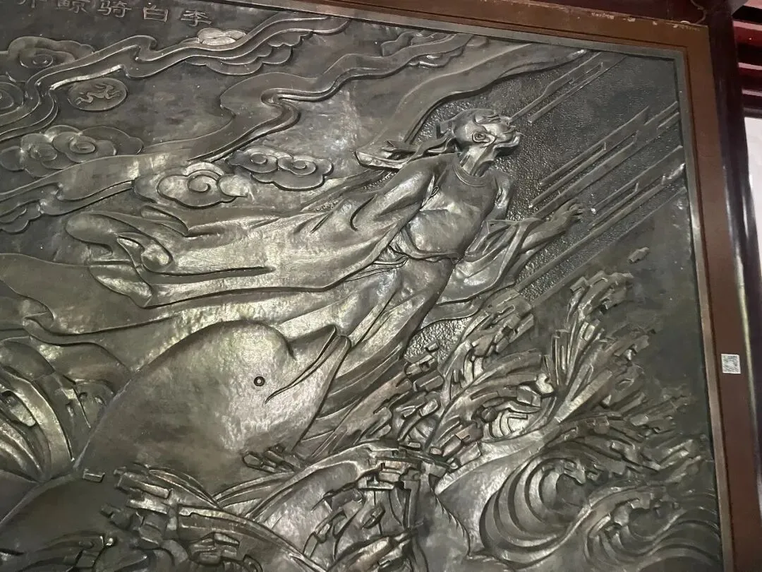 殿中供奉李白塑像,壁间嵌有“骑鲸升天”的铜画。