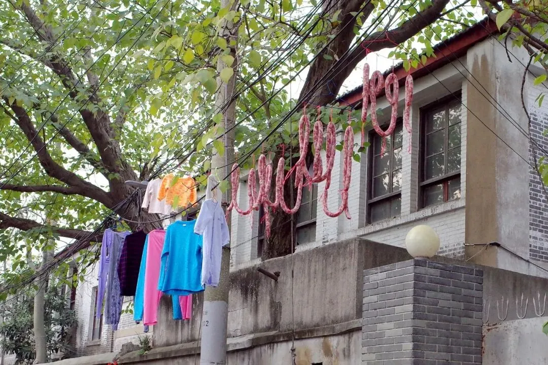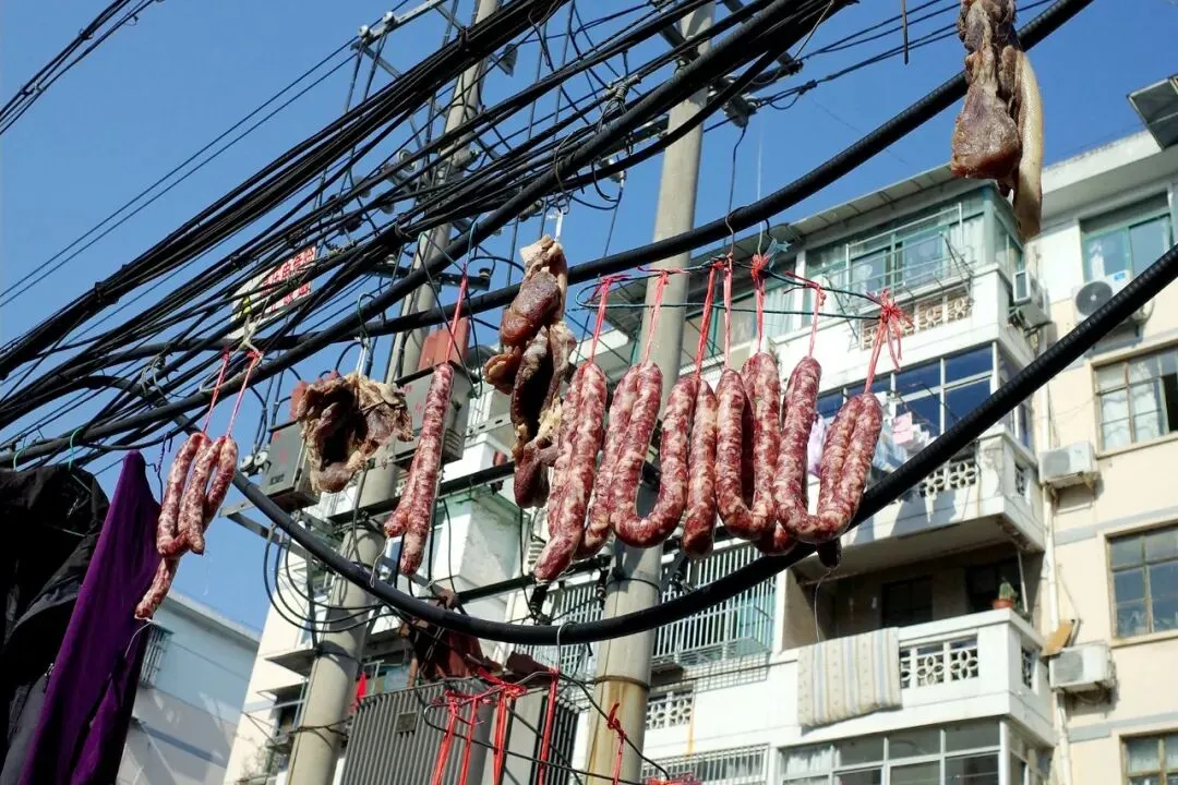 南京的冬天有一道奇特的风景线,居民区里到处都能看到挂着晾晒的香肠,东一堆西一堆的,少的有十斤二十斤,多的能有上百斤。过去跟香肠一起挂出来晾晒的会有咸鸡咸鱼咸肉之类的咸货,这些年吃咸货的人少了,挂在外面的咸货肉眼可见的减少,但香肠却一点没见少,看来香肠还是受欢迎的。