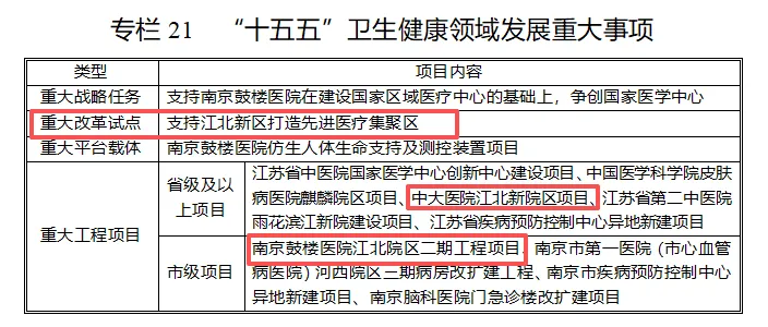 支持江北新区打造先进医疗集聚区,推进中大医院江北新院区、鼓楼医院江北院区二期建设。