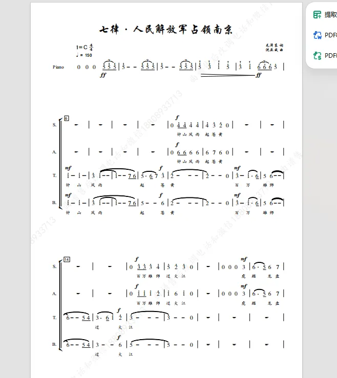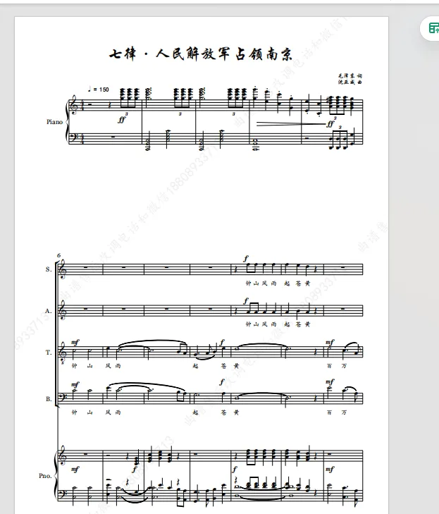 当前位置:首页>南京>《七律人民解放军占领南京》中国交响乐团合唱团 四声部 合唱总谱