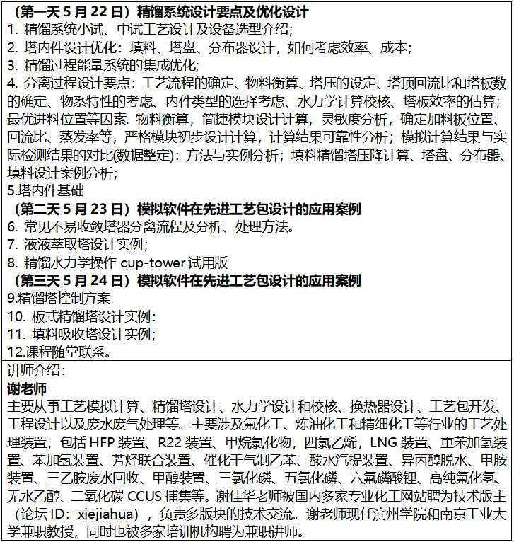 然而,在实际工程实践中,从实验室研发到工业化放大,常面临流程收敛困难、设备选型不当、能耗居高不下、控制系统设计薄弱等共性挑战。许多工程师虽掌握基础理论,但缺乏将先进模拟工具与工程经验深度融合,以系统性解决复杂精馏问题的实战能力。为此,我们特开设本课程,旨在构建从“小试中试”到“工艺包设计”的完整知识链条。课程聚焦精馏系统的核心设计要点、能量集成优化策略及模拟软件的高级应用,通过大量工业案例解析与实战练习,帮助学员攻克设计难点,掌握优化方法,全面提升在先进工艺包开发与节能降耗方面的核心竞争力,为企业培养能胜任复杂分离系统设计与优化的骨干技术人才。望相关单位积极参加,现将有关事项公布如下: