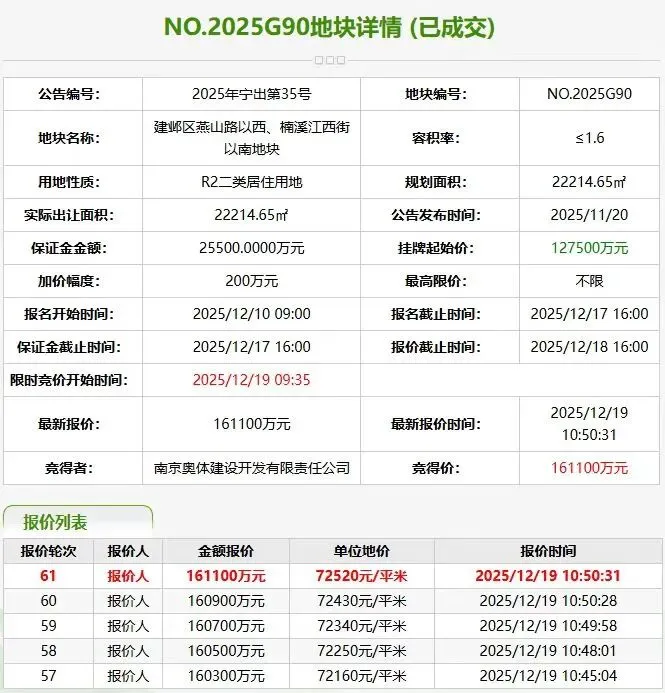 2025年,南京卖地收入707.4亿元,杀进全国前五。最炸裂的一幕发生在去年12月——由南京本土房企奥体建设拿下的河西中G90地块拍出45325元/㎡的楼面价,溢价率26.35%,一举打破尘封近十年的南京地王纪录。