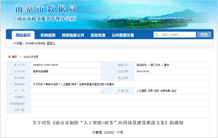 近日,南京市数据局、南京市城市数字治理中心联合印发《南京市加快“人工智能+政务”应用场景建设推进方案》。作为全省首个城市级“人工智能+政务”综合性专项推进文件,《方案》立足提升政府行政效能和运行效率站位,依托南京市级政务云算力和政务大模型基础能力,推动市各板块、部门聚焦政务服务、城市治理和民生服务等政务领域,按照“应建尽建”的原则打造政务智能体,持续推进“一部门一智能体”建设及应用,为南京政务领域人工智能应用提供系统性指引。根据《国务院关于深入实施“人工智能+”行动的意见》(国发〔2025〕11号)、《国务院办公厅关于加快场景培育和开放 推动新场景大规模应用的实施意见》(国办发〔2025〕37号)等文件精神,为进一步贯彻落实《南京市深入推进“人工智能+”行动打造国家人工智能创新应用先导区升级版实施方案》(宁政发〔2025〕189号),安全稳妥、集约高效、规范有序推进人工智能大模型在政务领域的应用,通过场景引领推动政企合作,制定本推进方案。按照“坚持管行业就要管人工智能应用推进和场景建设”的要求,市数据局牵头聚焦政务领域场景,依托市级政务云算力和政务大模型基础能力,推动全市各板块、部门立足提升政府行政效能和运行效率站位,按照“应建尽建”的原则打造政务智能体。通过构建部门“场景开放”、企业“调研验证”、政府“采购服务”机制,常态化面向社会公开发布“人工智能+政务”应用场景需求,吸引各类人工智能企业、数据企业和科技企业积极参与,政府匹配政策保障,助力我市人工智能产业高质量发展。顺应人工智能技术迭代发展趋势,积极推动市各板块、部门定期开放“人工智能+政务”应用场景,持续推进“一部门一智能体”建设。到2026年底,依托市级政务智算资源和政务大模型支撑能力,市级层面统建一批办公类通用智能体,市各板块、部门要结合相关职责建设具备显著标识性的N个专业型智能体,吸引参与企业数量不少于50家。1.建立协同工作机制:市数据局会同市数治中心,成立“人工智能+政务”应用场景建设专班(以下简称“专班”),启动工作推进计划研究,制定市各板块(部门)政务智能体场景需求征集表、南京市政务智能体建设指南等配套文件。2.健全场景需求管理:对市各板块、部门开展智能体建设需求梳理摸底,重点关注痛点、高频、高价值场景,确保征集场景“需求清晰、开放意愿明确、落地可行、复制性强、示范效应优”,同步形成场景储备库,定期更新并推动场景开放。结合需求程度、方案成熟度、预期成效进行场景评估,遴选后确定“人工智能+政务”应用场景需求榜单。3.启动服务项目立项:结合“人工智能+政务”应用场景需求榜单,市数治中心会同市各板块、部门按照“急用先行”原则联合编写“人工智能+政务”应用场景智能体服务采购可行性研究报告,启动信息化立项工作,按责任分工推进。对于涉及跨部门协同或多业务联动的重点场景,按照“谁主管谁负责”原则,由业务主责部门牵头推进实施。4.开展活动宣传发布:按要求结合全市产业发展大会、场景路演等“人工智能+”相关活动,启动“人工智能+政务”应用场景“调研验证”工作,面向社会公开市各板块、部门场景需求,开展企业技术调研和能力验证。(责任单位:各区、市各部门,市数据局、市数治中心)1.启动调研申报:通过政府官方网站、公众号等多种渠道进行场景公开,原则上每半年面向社会发布一次需求榜单,特殊情况可根据实际需要适当调整。届时对场景开放的部门需求、工作诉求、推广前景进行解读,并开放企业“技术调研”申报入口,同步发布政府采购服务意向公告。2.申报材料准备:各意向参与企业根据政务智能体需求申报指南等文件提供报送材料,包括企业情况、能力背景、技术方案、预期成果、预算概算等内容,按要求完成系统申报。3.开展企业辅导:依托南京人工智能政务大模型平台(MaaS)打造政务智能体实验工厂,组织有意向参与企业参加培训会,开展技术工作指导,发布“人工智能+政务”应用场景智能体开发技术等规范,并介绍政务智能体效能评估指标体系。(责任单位:各区、市各部门,市数据局、市数治中心)1.智能体环境搭建:入选场景需在政务智能体实验工厂环境内进行技术能力验证,由MaaS平台提供多源异构智算算力、支撑模型、知识管理工具平台等基础资源。各场景开放部门配合参与企业开展智能体模型开发,各区、各部门原则上必须开放业务数据,积极配合政务智能体建设。2.智能体能力验证:“技术调研”环节通过后,各意向参与企业需在政务智能体实验工厂指导下,限时完成目标场景的智能体部署并进入能力验证环节。能力验证采用技术运行和应用活跃度监测方法,对智能体产品进行试运行观察验证,开展技术验证和业务适配性测试,形成验证报告。3.智能体验证评优:在“人工智能+政务”应用场景验证结束后,专班统一组织场景开放部门、技术评审专家召开政务智能体“调研验证”工作评审会,通过能力验证的智能体成果均可由MaaS平台模型广场对外推广。专班集中对全部政务智能体成果进行评优。(责任单位:各区、市各部门,市数据局、市数治中心)1.招标采购:结合调研验证情况和项目立项批复要求,市数治中心统一发布本轮“人工智能+政务”