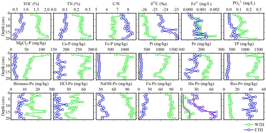 Fig. 1. Variation in nutrient levels and P fractions in sediments. WTH and ETH refer to western Cyanophyta-dominated region and easternmacrophyte-dominated region in Taihu Lake, China. The purple solid lines represent fitting curves for Hu-Po in the two regions.