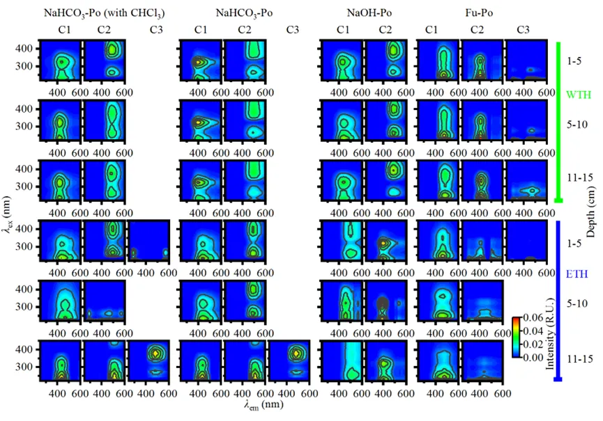 腐殖质态磷(Hu-Po)的分解在磷矿化途径中占据主导地位。沉积物中的颗粒态磷主要以腐殖质组分和生物残骸的形式存在。高分辨率荧光光谱分析显示,与磷组分相关的溶解有机物(DOM)在不同区域间呈现出成分差异,这些差异反映了区域间磷矿化潜力的不同。在所有组分中,腐殖质类和富里酸类物质占据主导地位,表明其分子骨架具有高度相似性——尤其是在分解潜力更强的NaHCO3-Po和Biomass-Po中。值得注意的是,腐殖质类物质通常具有较高的分子量和更强的芳香性,而富里酸类物质的分子量相对较低。高溶解氧浓度会促进表层沉积物中腐殖质类物质的分解。随着沉积深度增加,荧光强度逐渐减弱,这一趋势与NaHCO3-Po和Biomass-Po增强的分解潜力相一致。由于Biomass-Po代表易于裂解的细胞物质,其荧光强度的下降表明该类磷库对厌氧矿化过程更为敏感。在蓝藻优势区,富里酸相关磷(Fu-Po)中检测到更强的富里酸类信号,反映出Fu-Po作为主要组分的富集特征。该区域表层沉积物的光谱显示芳香性特征及高分子量蛋白质样结构,这与Fu-Po的稳定性及其相当的荧光强度特征高度吻合。Fig. 2.Fluorescence signatures of excitation–emission matrices for dissolved organic matter associated with different Po fractions. The color variation in contours denotes the fluorescence intensity. NaHCO3-Po (with CHCl3) and Na Fu-PoHCO3-Po differentiate the Po fractions obtained with and without CHCl3 treatment, respectively. Ex and Em denote excitation and emission wavelengths, respectively.