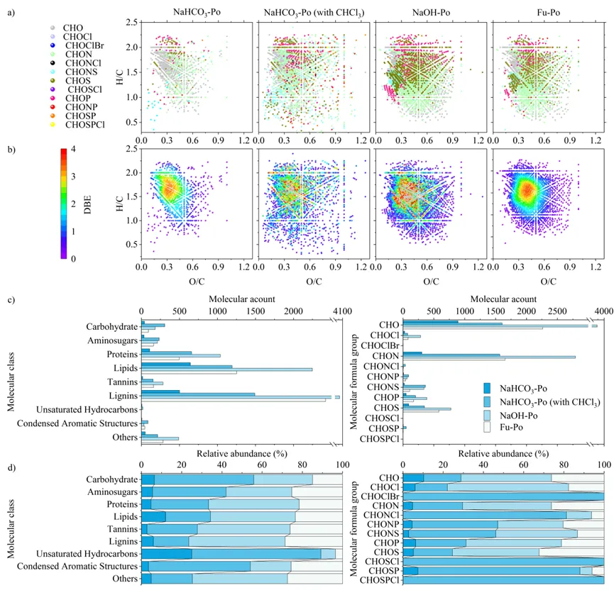Fig. 3.Molecular composition of different Po fractions. Molecular composition (a) and double bond equivalent (DBE) values (b) highlight compositional and structural differences. Molecular classes (c) and relative proportions (d) vary across different Po factions. Colors represent distinct elemental classes and molecular compositions.