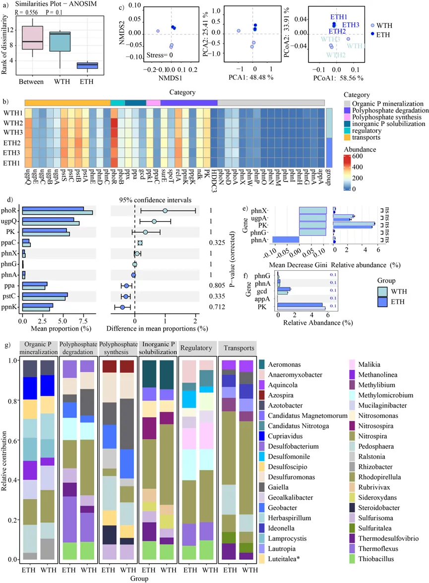 编码phoD 基因的细菌在磷矿化及溶解活性磷(SRP)富集途径中发挥主导作用。碱性磷酸酶(APase)对有机磷的酶解作用是 SRP 的主要来源。宏基因组分析显示,两个研究区域中磷矿化细菌群落的相对丰度相近,均约为20%。在所有磷酸酶编码基因中,phoD 基因的丰度最高,超过phoA等其他类型,这一结果与phoD在多种水生生态系统中的普遍优势地位一致。尽管两个区域在 β 多样性上存在细微差异,但phoD丰度并无显著不同,凸显了该基因在湖泊沉积物中的广泛分布。在属水平上,Nitrospira、Cupriavidus和Herbaspirillum是主要的phoD 编码菌,这一发现与其他湖泊研究的数据相吻合。共现网络分析与桑基图分析进一步揭示,若干低丰度(即“稀有”)phoD编码菌属(如Variovorax、Thioalkalivibrio等)的中心性高于Nitrospira等高丰度类群,表明这些稀有但高度连接的类群与高丰度功能群共同协同调控磷矿化过程。环境变量(包括各类磷组分)与高丰度及稀有phoD编码类群均呈正相关,进一步支持了磷矿化过程由两者联合调控的模型。Fig. 4.Functional microflora and genes involved in P cycle based on metagenomic sequencing. (a) Anosim analysis; (b) Category heatmap; (c) β-diversity analysis (nonmetric multidimensional scaling, principal coordinate analysis, and principal component analysis); (d) STAMP analysis; (e) Random forest classification; (f) Wilcoxon test; (g) Taxononic composition of the top 10 genera.异养代谢通过沉积物中含磷有机物的矿化作用,也被证实对SRP的释放具有显著贡献。然而,我们的研究结果表明,在高磷条件下,APase的酶促水解是SRP补充的主要途径。关于APA与SRP之间耦合关系的既往研究存在争议:在磷耗尽环境中,APA水平通常被报道升高,而我们前期的研究发现,在SRP含量较低的区域APA水平反而更高。与此相反,也有研究报道APA与SRP呈正相关关系。本荟萃分析的结果有助于澄清这一争议:APA、Po含量与phoD基因丰度三者之间呈正相关共变关系,表明较高的Po储量与编码phoD的微生物群落共同提升了APA水平,并通过磷的水解作用促进了SRP的生成。结合偏最小二乘结构方程模型(PLS-SEM)分析,这些发现进一步证实,Fu-Po通过酶促矿化作用对 SRP 的生成产生了系统性的关键影响。