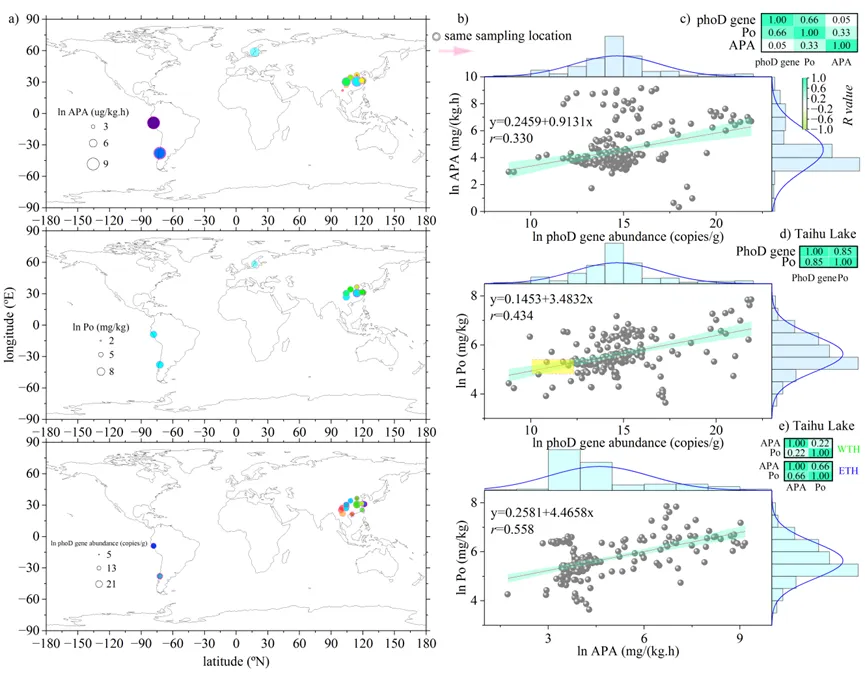 Fig. 5. Relationship among APA, Po, and absolute abundances ofphoD in sediments. (a) Global sediment data . (b–e) Distribution and correlation analysis among APA, Po, and absolute abundances of phoD. Different colors differentiate between the level of parameters across sites. Pearson’s correlation coefficient was used for linear fitting. The yellow field refers to the natural logarithm of absolute abundances of phoD vs. Po concentrations in the sediments from Taihu Lake. APA, alkaline phosphatase activity.本研究综合稳定同位素分析、溶解有机物荧光光谱、FT-ICR-MS 及宏基因组学等技术,证实沉积物中的磷库主要由蛋白质与木质素构成,且phoD介导的水解作用可将结合态磷转化为SRP。磷矿化的速率与程度受分子组成特征(如Fu-Po的芳香性与分子量)与微生物网络结构(包括高丰度及具有高连接性的稀有phoD表达类群)的共同调控。上述机制性发现表明,相较于直接控制磷酸盐含量,调控磷的生物可利用性可能更有效地限制内部SRP负荷并缓解湖泊富营养化,从而更有力地保障环境可持续性。袁和忠:博士,南京信息工程大学环境科学与工程学院副教授,硕士生导师。长期从事湖泊生态系统中磷、碳等生源要素的环境生物地球化学循环过程研究。通讯邮箱:yuanhezhong@nuist.edu.cn。