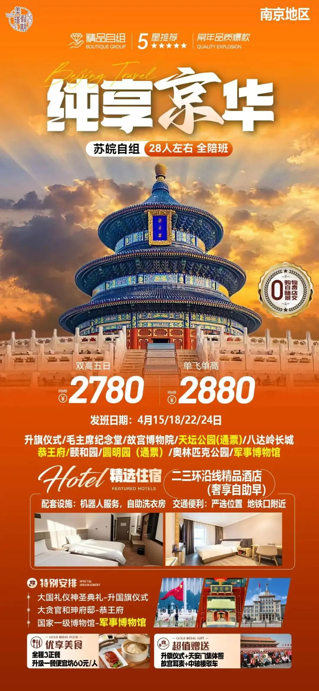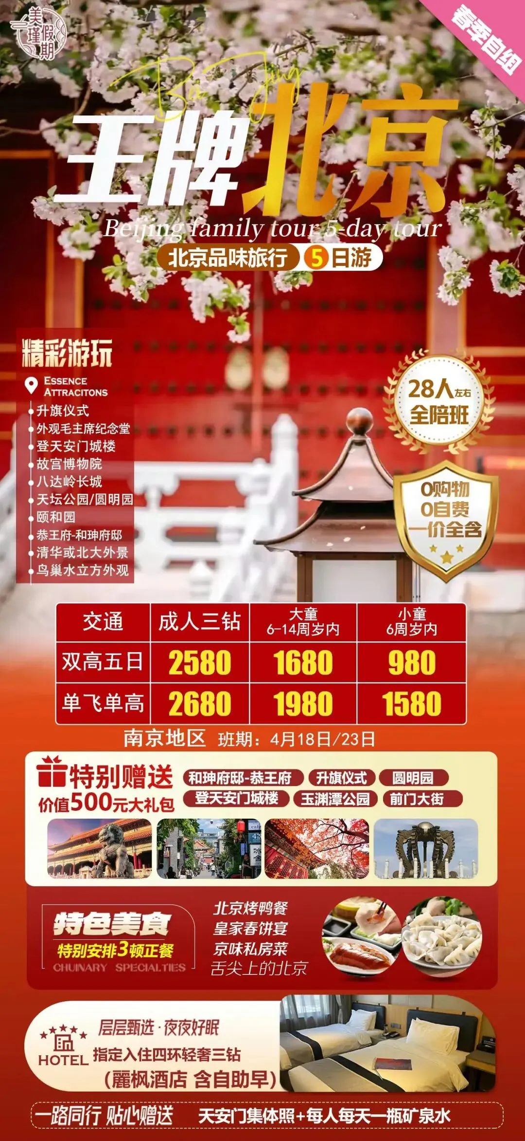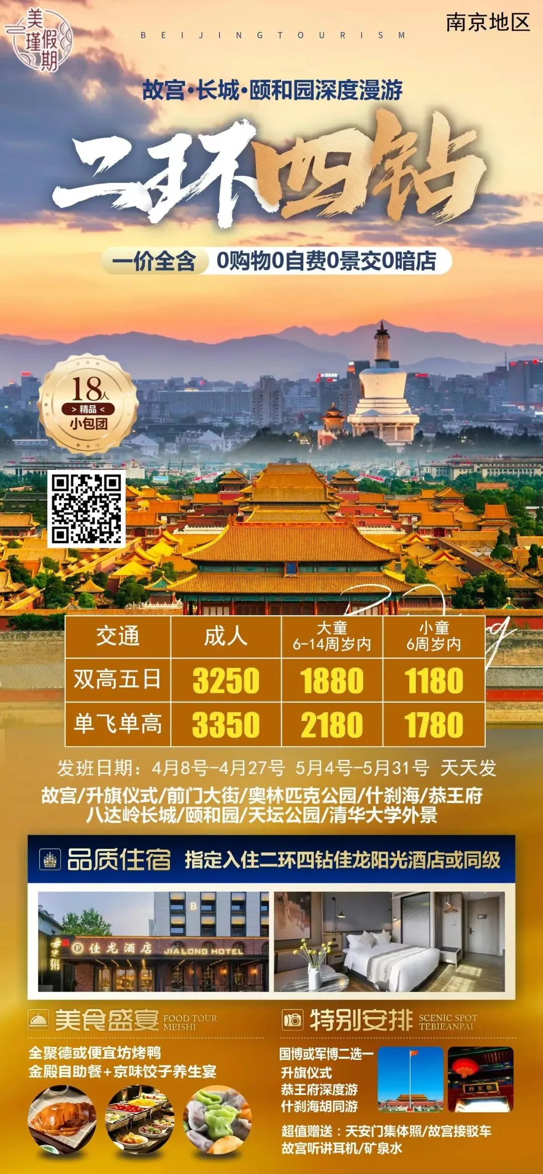 (28人精品)4🈷<北京全陪班>王牌北京 🎙4月18/23 🏅真纯玩➕️全陪导游全程陪同 📍指定轻奢三钻#丽枫酒店(自助早) 🍝老北京烤鸭/京味菜/春饼宴 ✅️特别安排-登天安门城楼+圆明园通票 |