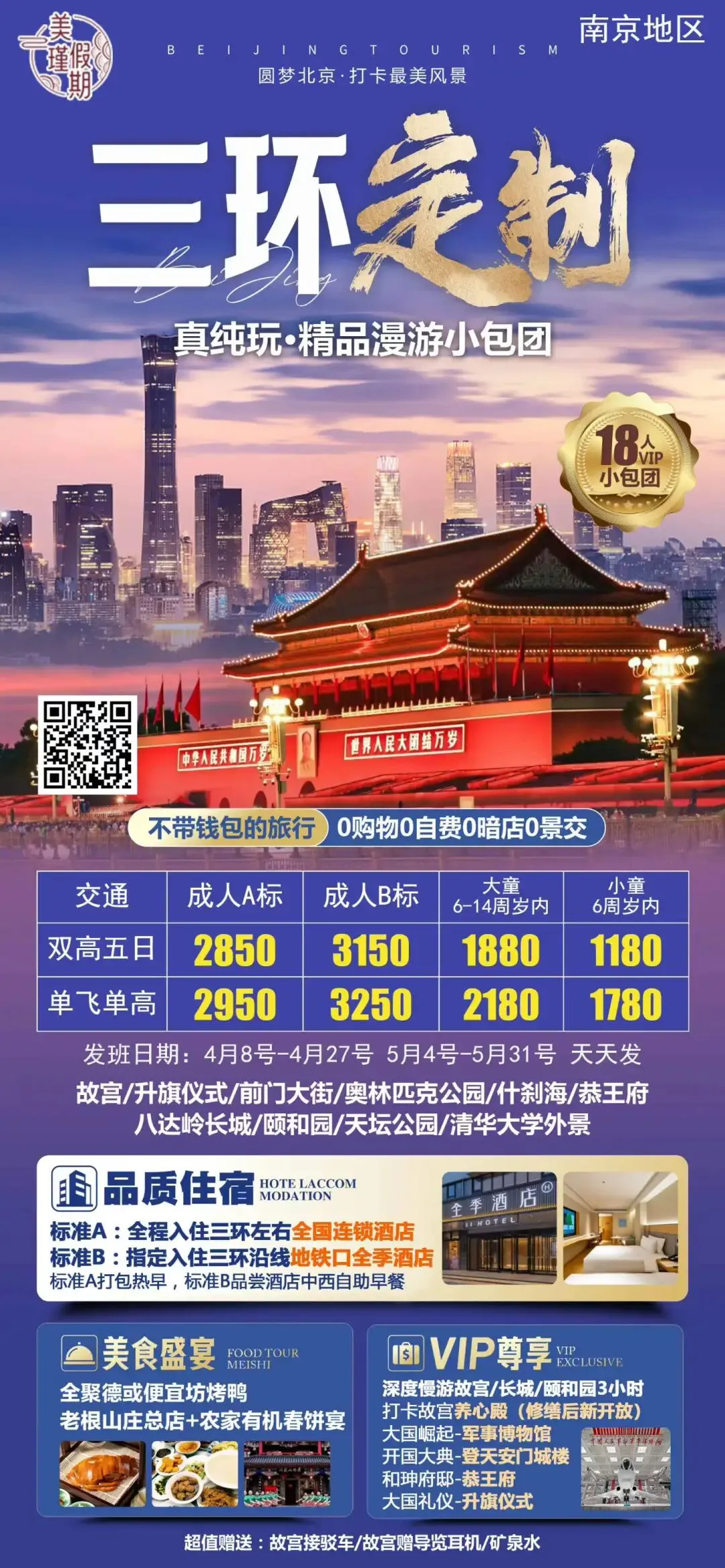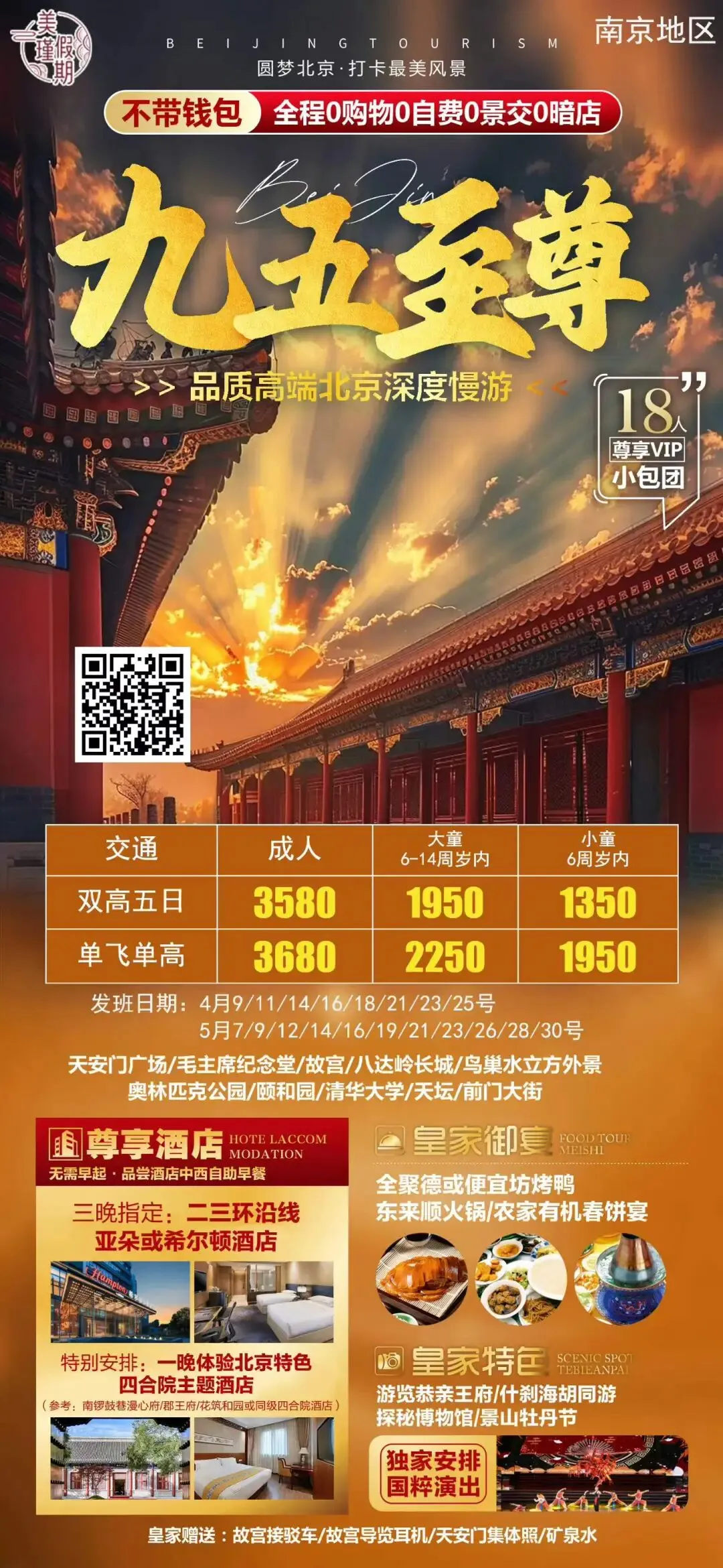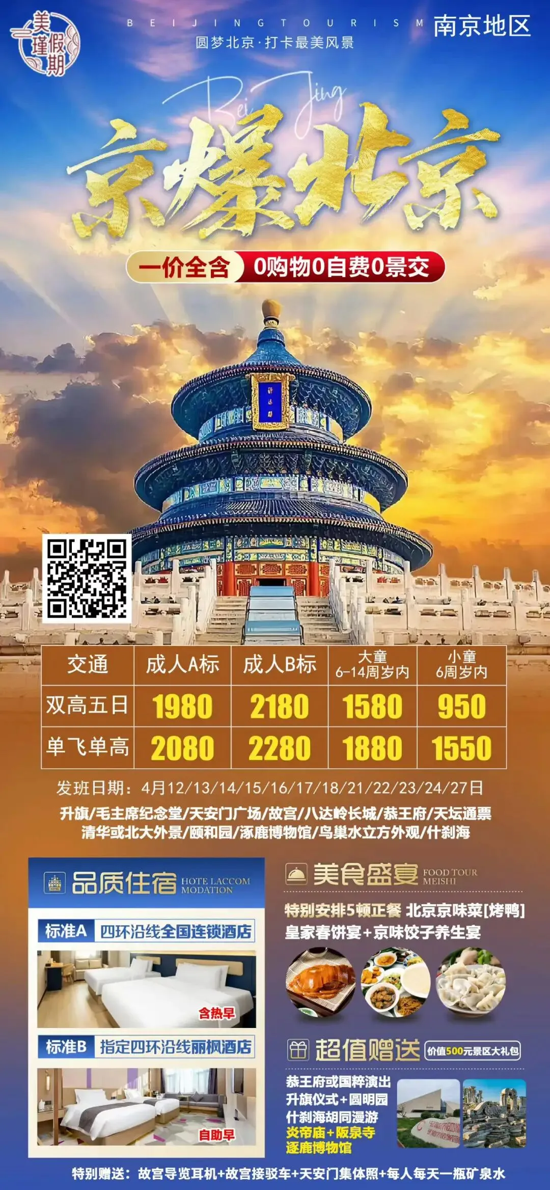(28人精品)4🈷<北京全陪班>王牌北京 🎙4月18/23 🏅真纯玩➕️全陪导游全程陪同 📍指定轻奢三钻#丽枫酒店(自助早) 🍝老北京烤鸭/京味菜/春饼宴 ✅️特别安排-登天安门城楼+圆明园通票 |