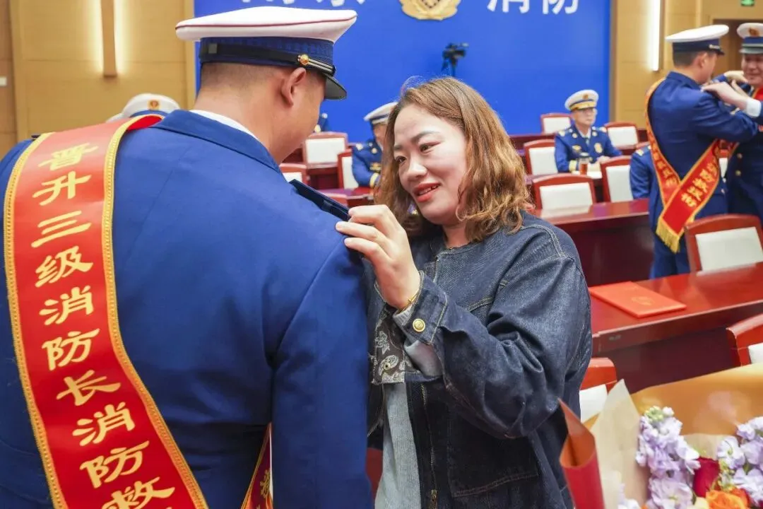 政治部主任滕峰宣读高级消防员晋升消防救援衔命令,与会领导为晋衔高级消防员颁发命令状。家属为晋衔高级消防员更换肩章