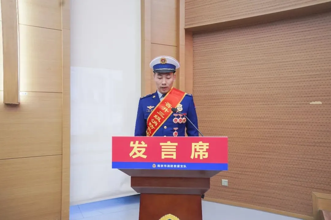 尧化门特勤站三级消防长江波同志作表态发言,表示将坚守初心、苦练本领、严守纪律,以更加坚定的信念、更加昂扬的斗志、更加务实的作风投身消防救援事业,永做守护平安的螺丝钉、危难时刻的逆行者、人民群众的贴心人。