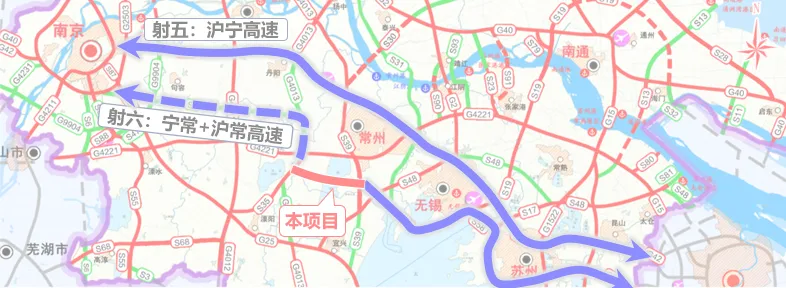本项目路线起自与扬乐高速公路交叉处,止于与沪常高速公路交叉处,是《江苏省高速公路网规划(2017—2035年)》中“射六线”——沪宁第二通道的关键组成部分,编号S2。路线全长约30公里,采用双向六车道高速公路标准,设计速度120公里/小时。项目建成后将大幅提升区域路网连通效能,有效缓解沪蓉高速公路、沪武高速公路交通压力,强化南京都市圈与苏锡常都市圈的联动,为沿线区域的产业集聚、新型城镇化发展及文旅资源开发提供高效的交通保障。
