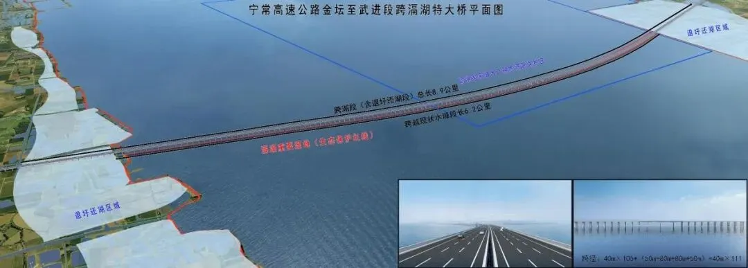 滆湖特大桥是全线控制性工程,跨越重要水体--滆湖,在设计过程中始终坚守“生态优先”的理念,通过优化桥跨布置、创新设计排水系统等多项举措,最大限度降低工程建设对生态环境的影响。同时配套建设桥梁健康监测系统和低能见度工况下的行驶诱导系统,实现生态保护与运营安全的双重保障,打造人与自然和谐共生的示范工程。