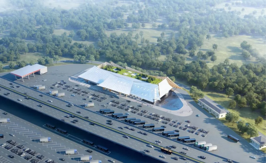 本项目滆湖东服务区以“低碳示范”为核心定位,房屋建筑融入地域自然意象与新能源技术,同步设置新能源展示功能区,响应常州“新能源之都”定位,同时整合屋面分布式光伏、光伏车棚等清洁能源设施,结合储能与充电系统,打造集交通服务、能源示范、文化展示于一体的交能融合新标杆。