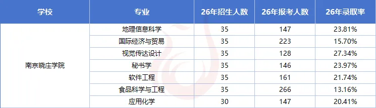 南京晓庄学院2026年五年一贯制专转本各专业招生人数和录取率如图所示: