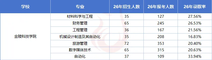 金陵科技学院2026年五年一贯制专转本各专业招生人数和录取率如图所示: