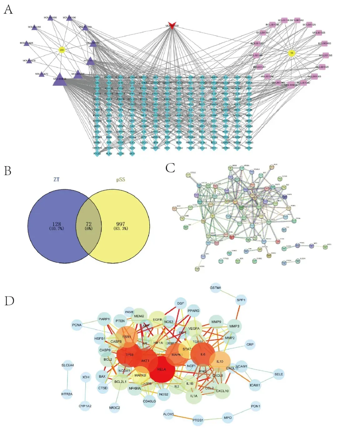 原发性干燥综合征(pSS) 是一种常见的自身免疫性疾病,具有较高发病率。pSS 患者以女性为主,男女发病比例约为 1:9,多见于 20–60 岁人群,50 岁左右为发病高峰。其主要病理为外分泌腺损伤,临床症状包括口干、眼干、皮肤干燥、疲乏及关节痛等,其中疲劳与关节痛显著降低患者生活质量。目前,pSS 的主要治疗方法为激素及免疫抑制剂。相比之下,中医复方用药被认为疗效较好且不良反应较少,但其作用机制尚不明确,缺乏循证支持,仍需进一步研究。本课题组此前曾应用汪悦教授创制的麦冬地芍汤(MDDSD) 治疗 pSS,取得了良好的临床效果 。其组方包括:麦冬 20 g、生地黄 15 g、白芍 15 g、紫菀 10 g、桃仁 10 g。其中,紫菀与桃仁作为辅药,构成了经典的药对。紫菀可助水上行以滋润,桃仁则可导水下行以通便。我们还探索了该方的相关作用通路,如血管活性肠肽(VIP)信号、调节性 T 细胞(Treg)以及颌下腺保护机制,以阐释其治疗 pSS 的作用基础。然而,尽管基于 ZT 药对的治疗策略在 pSS 管理中取得了积极进展,其活性成分的作用机制及具体靶点仍不清楚,有待进一步研究。因此,本文拟通过网络药理学与分子对接技术,探讨 ZT 在治疗 pSS 中的分子机制。首先,我们应用网络药理学与分子对接方法筛选 ZT 的关键活性成分及其在 pSS 治疗中的主要作用靶点;其次,预测 ZT 发挥作用的潜在信号通路并分析其靶点互作关系;最后,结合体内实验对所提出的作用机制进行初步验证,以揭示 ZT 治疗 pSS 的药效机制。1. ZT 化合物与 pSS 靶基因鉴定及 PPI 网络分析
