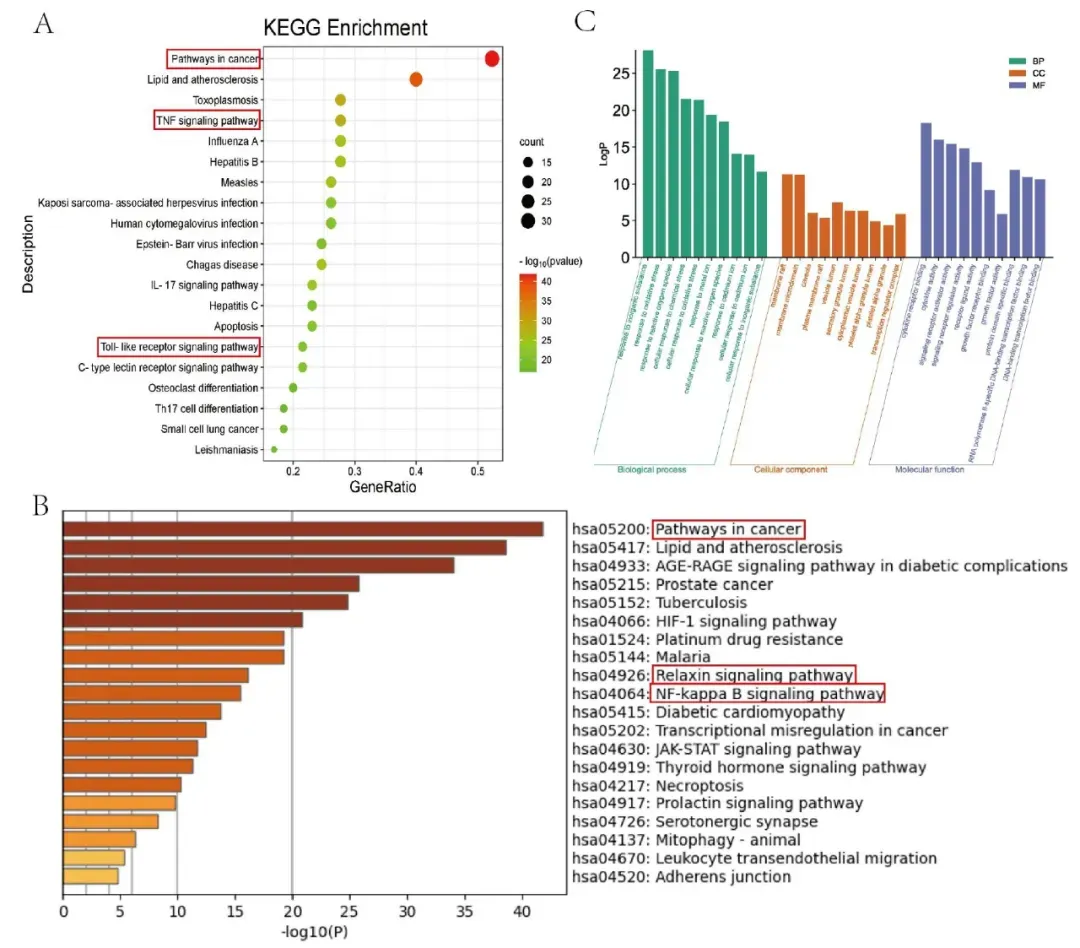 KEGG 富集分析共筛选出 155 条信号通路(图 2A、2B),其中气泡图展示了前 20 个显著通路,热图则直观呈现了相关通路的分布情况。结果显示,ZT 干预 pSS 的作用机制与多种病理过程密切相关,包括 NF-κB/RELA、TNF 信号通路、干扰素信号、病毒感染、炎症反应、TLR 受体激活及自身免疫等。其中,以 RELA 介导的癌症相关通路最为显著。此外,富集分析还提示 pSS 的发病机制可能与细胞凋亡诱导、病毒感染易感性、炎症刺激应答机制以及反复刺激所触发的抗体介导免疫密切相关。