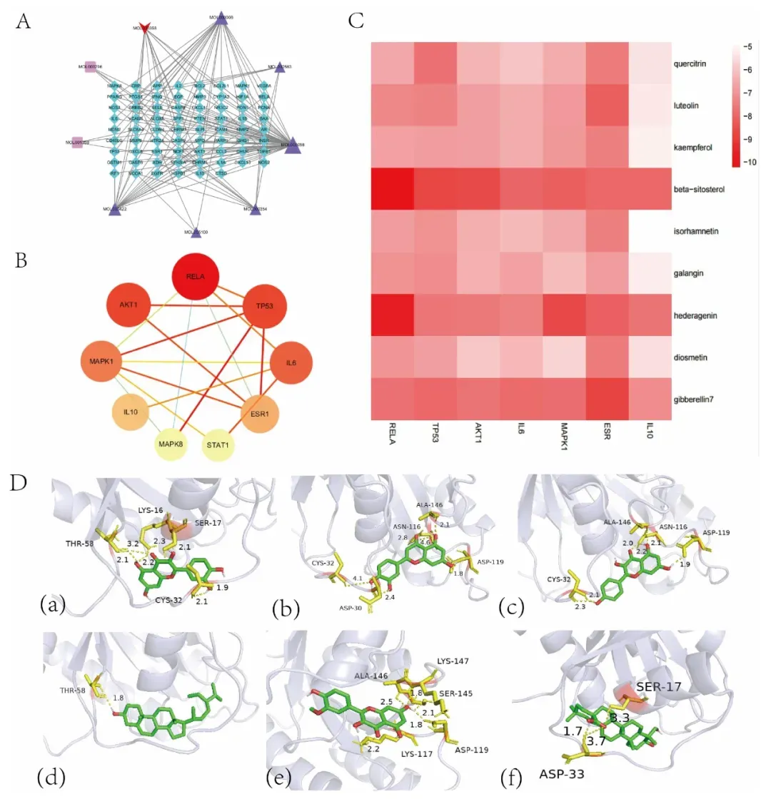 对 ZT 活性成分靶点的 Degree 值进行计算与筛选(图 3A),共鉴定出紫菀与桃仁中的 9 种活性成分,分别为槲皮苷、木犀草素、山柰酚、β-谷固醇、异鼠李素、甘丙肽、常春藤皂苷元、香叶木素和赤霉素 7。在这些化合物中,筛选出得分较高的前五个核心分子作为小分子配体用于分子对接。同时,PPI 网络分析鉴定出 7 个与疾病相关的核心靶蛋白,并将其定义为 pSS 核心靶点蛋白(图 3B,表 3)。这些受体蛋白与已鉴定化合物的分子对接结果如图 3C 所示。