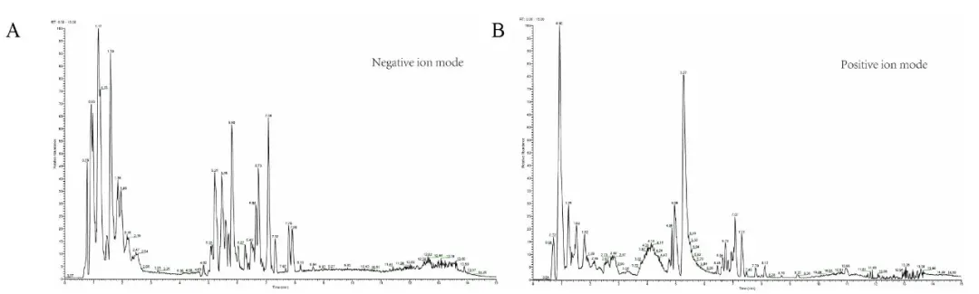 ZT 水提物的代谢产物经质谱(LC-MS)总离子流图分析如图 4 所示,共鉴定出 429 种代谢物成分,包括槲皮素、木犀草素、山柰酚、异鼠李素等。所有已鉴定化合物的质量误差均小于 5 ppm。LC-MS 结果显示,ZT 的部分核心成分与分子对接结果总体一致,提示 ZT 水提物中确实含有治疗 pSS 的有效成分。