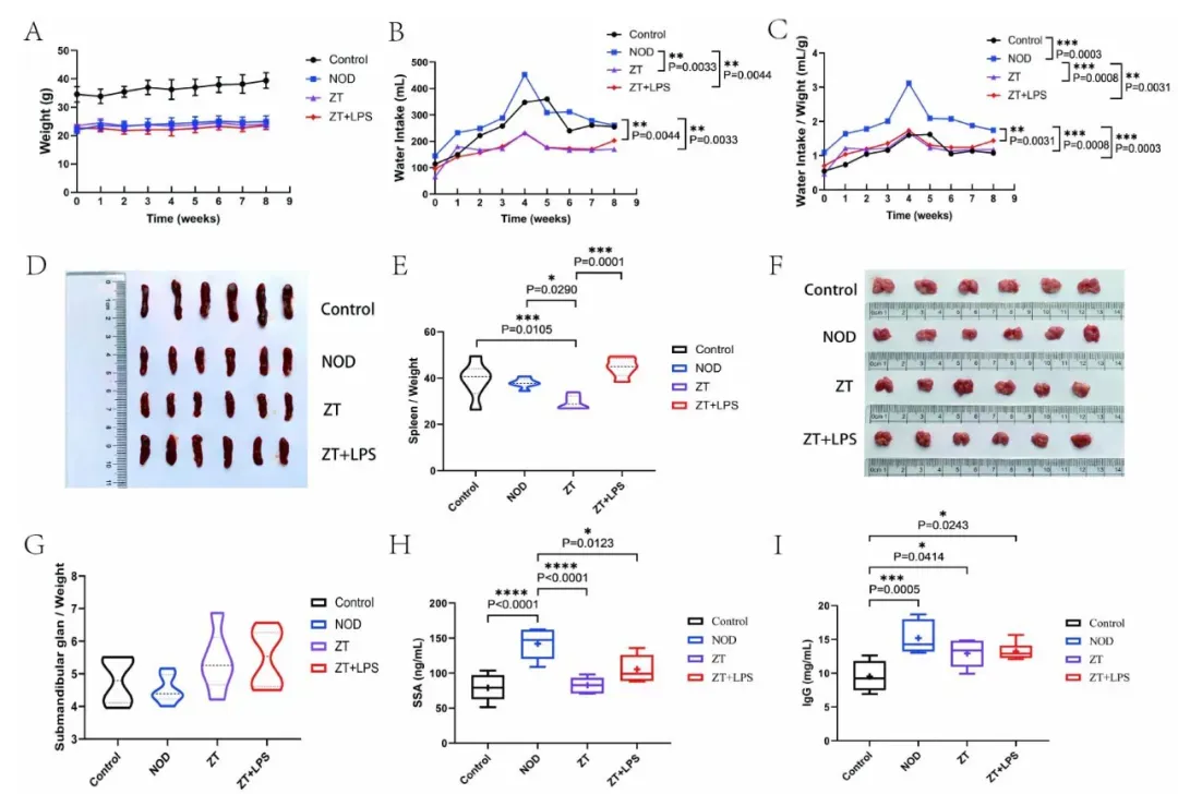 NOD 小鼠表现出典型的“干燥”症状,包括体重差异和饮水量显著增加,符合自发性 pSS 的病理特征。ZT 干预后,小鼠饮水量明显下降并接近对照水平,提示口干症状得到改善。脾脏指数在 ZT 组呈显著改善,提示其对免疫实质具有干预作用,而颌下腺指数无明显差异。ELISA 结果显示,ZT 能下调 NOD 小鼠 SSA 和 IgG 水平,提示其可能通过调节免疫功能发挥治疗作用。