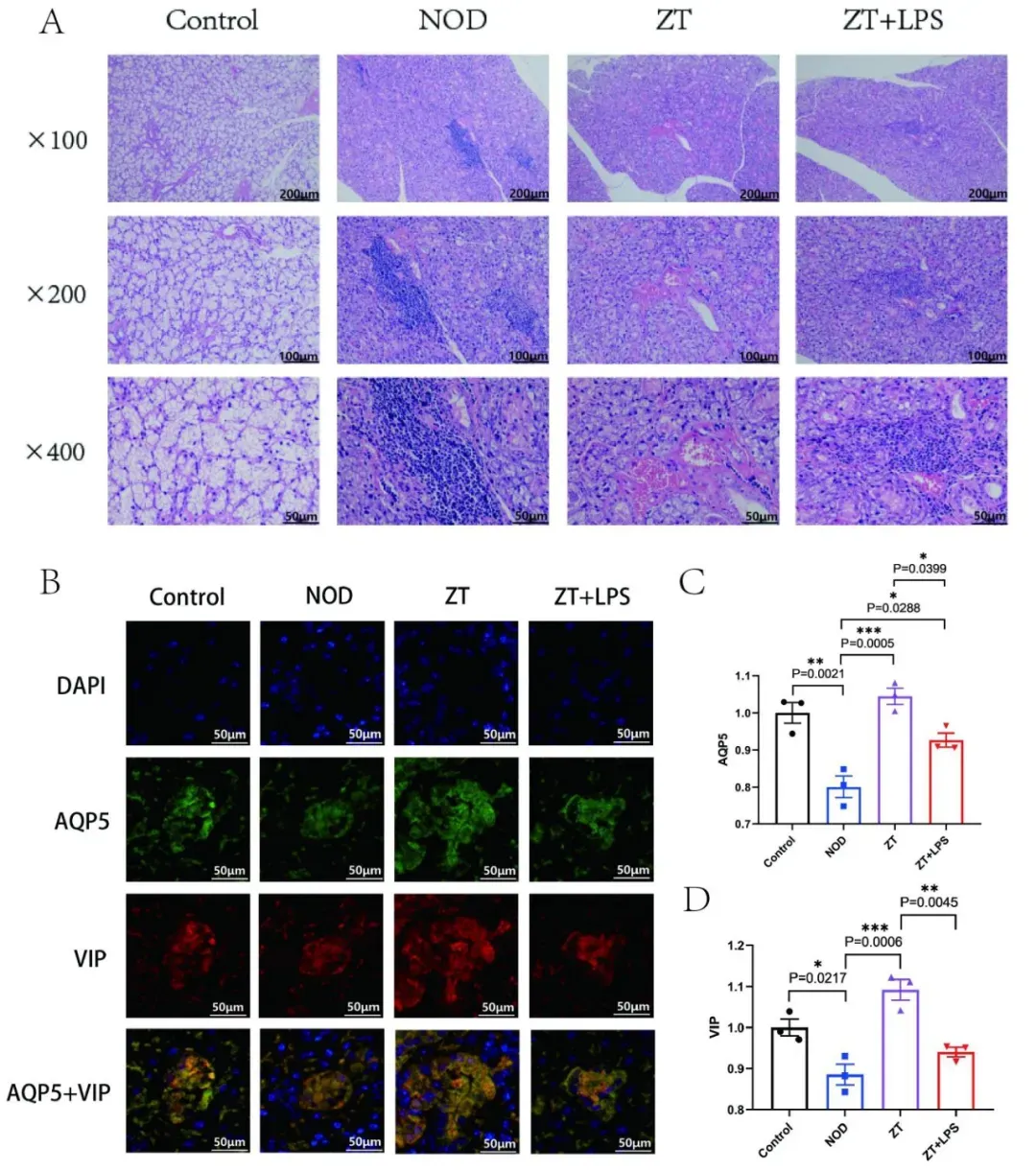 Figure 5 The result of efficacy assessment结果显示,ZT 治疗可减轻 NOD 小鼠颌下腺的淋巴细胞浸润和组织间质紊乱,病理损伤程度较 NOD 组明显改善。免疫荧光分析进一步表明,ZT 能显著提高颌下腺中 AQP5 和 VIP 的表达水平,而炎症刺激会降低其表达。这提示 ZT 对改善腺体组织结构和促进功能相关蛋白表达具有积极作用。