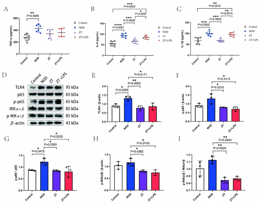 结果显示,NOD 小鼠 TNF-α 水平较对照组显著升高,提示其与 pSS 的发生相关。ZT 干预后,炎症因子 IL-6 与 IL-1β 水平均明显下降,并且在 ZT 组与 ZT+LPS 组之间亦存在差异,说明 ZT 能有效抑制炎症因子表达。Western blot 结果显示,NOD 组 TLR4 表达升高,而 ZT 治疗后 TLR4 表达下降,提示其可降低炎症通路上游蛋白水平。虽然各组总 p65 与总 IKKα/β 表达无显著差异,但 ZT 处理组的 p-p65 和 p-IKKα/β 均较 NOD 组明显降低,p-p65/p65 与 p-IKKα/β/IKKα+β 比值亦显著下降。综合结果提示,ZT 可能通过抑制 TLR4 表达并下调 NF-κB 通路中 p65 和 IKKα/β 的磷酸化,从而发挥治疗 pSS 的作用