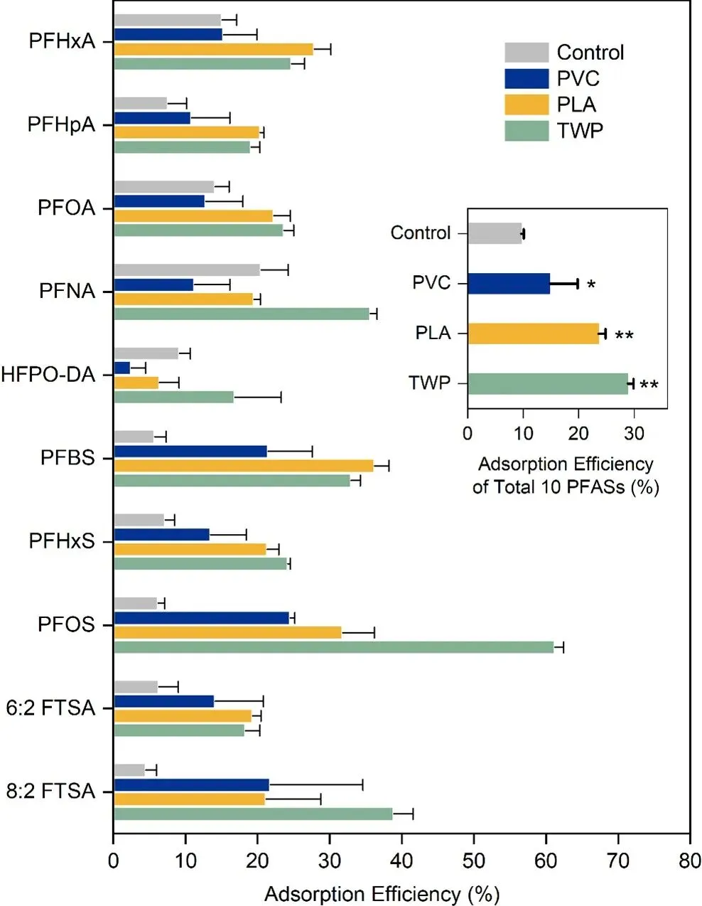 全氟和多氟烷基物质(PFAS)因其优异的疏水疏油性能,被广泛应用于工业生产和日常消费品中。同时,PFAS也具有较强的环境持久性和生物累积潜力,可以被蔬菜吸收转运至可食部位,最终通过食物链进入人体。已有研究表明,膳食摄入是非职业暴露人群PFAS的重要来源,其中叶菜类对人体暴露的贡献在部分地区可超过60%。此外,微塑料作为农业土壤中的新兴污染物,也广泛存在于农膜覆盖、污水灌溉、污泥施用和大气沉降等场景中。微塑料不仅可能直接吸附PFAS,改变其环境行为,还可能通过干扰土壤性质和植物生理过程,进一步影响PFAS的植物吸收与迁移。尽管微塑料与PFAS在农田中广泛共存,不同类型微塑料对植物富集PFAS的影响及作用机制,仍缺乏系统认识。针对这一问题,南京大学环境学院崔昕毅教授课题组选取传统塑料聚氯乙烯(PVC)、可降解塑料聚乳酸(PLA)和新型塑料轮胎磨损颗粒(TWP)三类典型微塑料,以小青菜为模型植物,系统比较了不同微塑料类型对10种PFAS物质吸收和累积的影响;并结合吸附实验、植物生理指标、基因表达和代谢组学分析,揭示了微塑料类型依赖的差异作用机制。