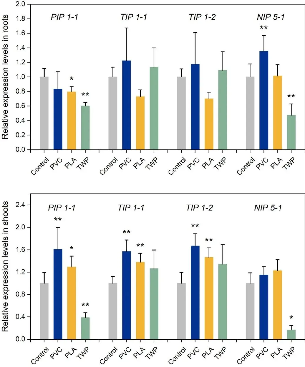 图5. 微塑料处理下小青菜根和地上部水通道蛋白基因的相对表达水平。在 0.5% 添加量下,比较了 PVC、PLA 和 TWP 处理组相对于对照组的小青菜根部和地上部水通道蛋白基因表达变化。∗ p < 0.05,∗∗ p < 0.01。