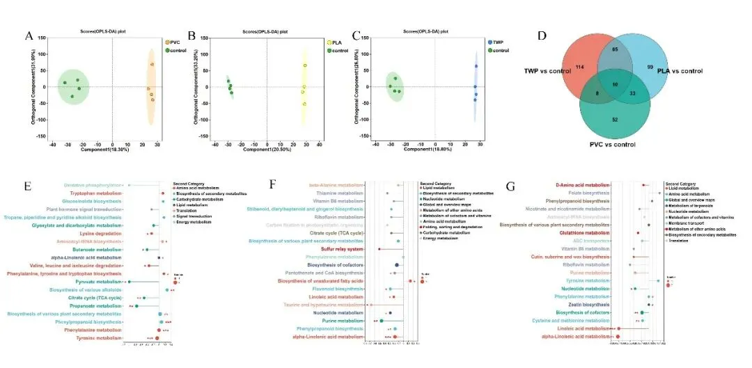 图6. 微塑料处理下小青菜地上部代谢谱特征及代谢通路富集分析。在 0.5% 添加量下,小青菜地上部代谢物在 PVC(A)、PLA(B)和 TWP(C)处理组中的正交偏最小二乘判别分析(OPLS-DA)结果;对照组与 PVC、PLA、TWP 处理组差异代谢物的 Venn 图(D);以及 PVC(E)、PLA(F)和TWP(G)处理下小青菜地上部 KEGG 代谢通路的差异丰度评分。