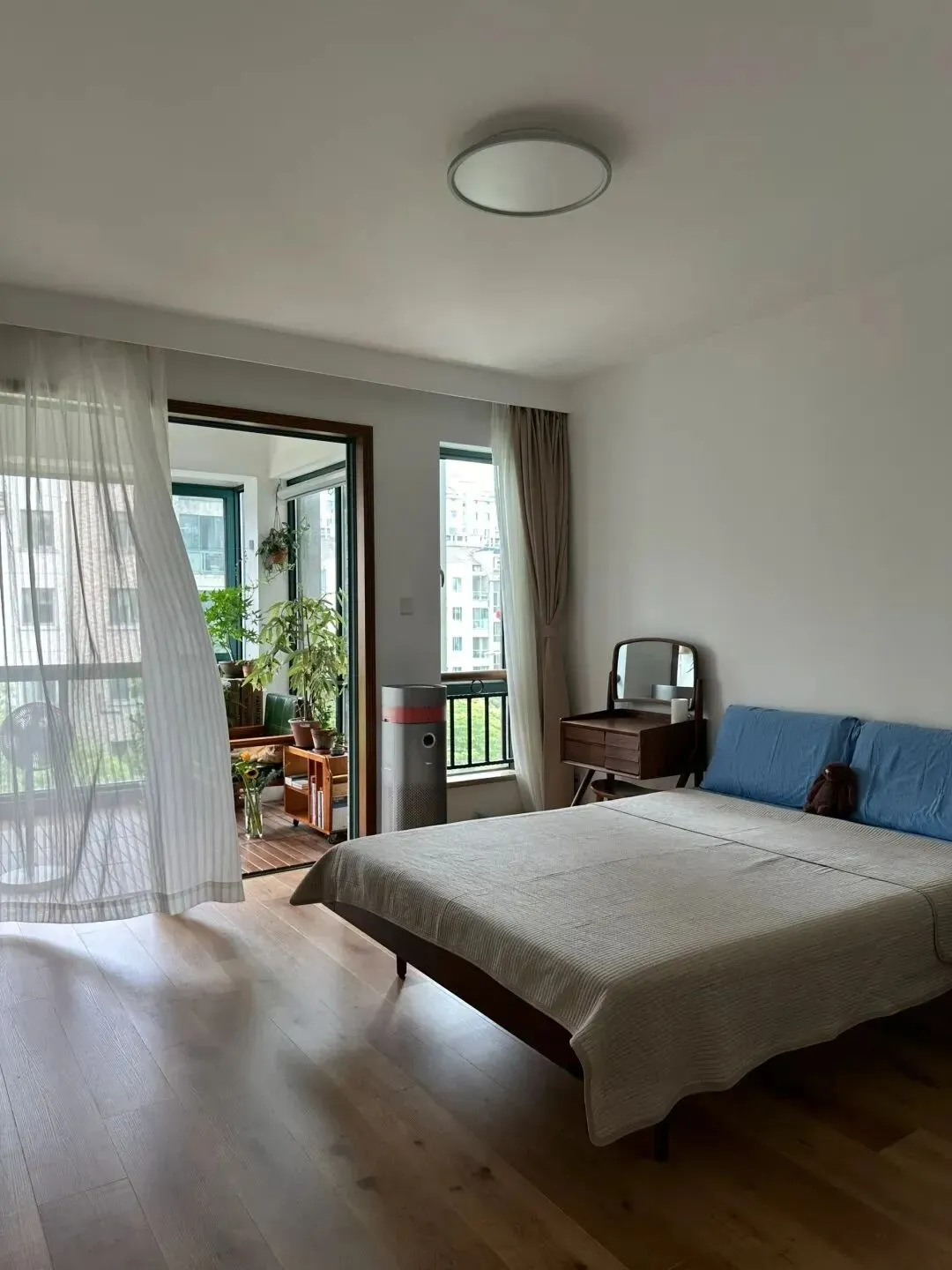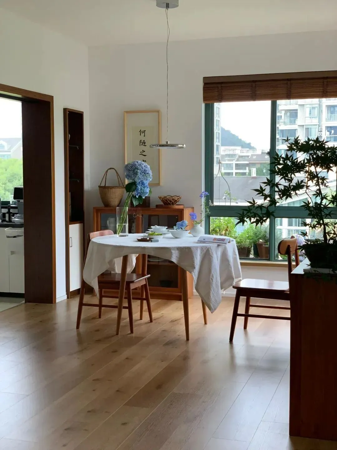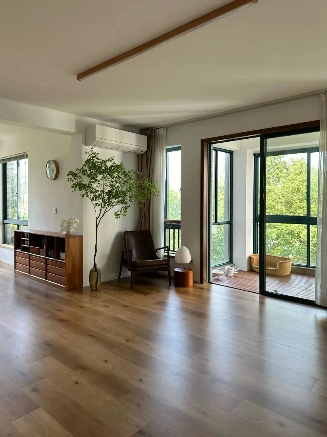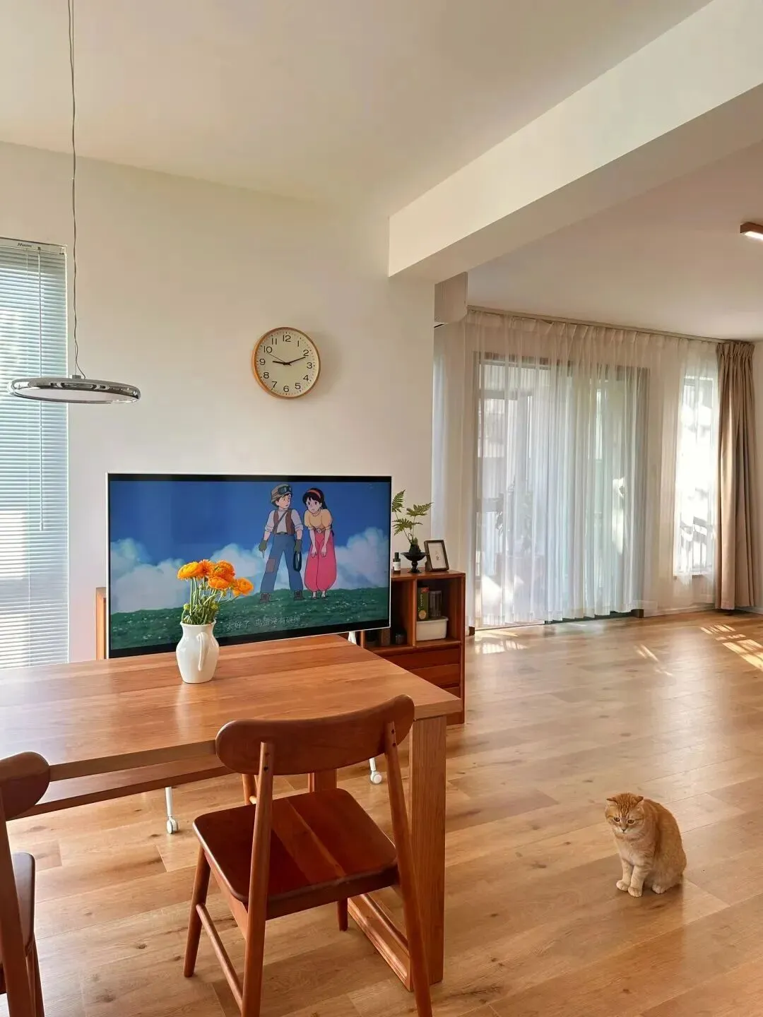 生活里总听到朋友抱怨,家里越住越乱,空间越装越挤,明明买了不少收纳神器,最后还是一屋子的杂物堆得人心烦。 其实,家这个地方,最重要的不是怎么堆满和填补,而是在有限的空间里,找到属于自己的松弛感。 这次看到南京一位退休阿姨的家,忽然觉得,原来家可以这样生活——不紧不慢,干净清透,什么都恰到好处。 刚进门的那一刻,最打眼的不是堆满的鞋柜或者杂物架,而是那种开阔的呼吸感。 进门能看到原木色地板一路延伸到客厅,阳光透过窗子洒进来,空气像被洗过一样透亮。 地上什么都没多余,连门口都没有堆放拖鞋或杂物,只留下一点点留白,让人一进屋就能卸下一身的疲惫。继续往里走,整个客厅一览无余,地面上几乎没有任何障碍,空间被彻底释放出来。 一只猫懒洋洋地躺在地板中央,仿佛在告诉你这里就是该这样慢下来。 家具以木质为主,色调温和,低矮的电视柜、靠窗摆着一把单人椅,旁边还有一株高大的绿植。 这些细节都没有喧宾夺主,而是让空间多了些呼吸的余地。客厅和阳台之间用大面积玻璃门隔开,光线毫无阻隔地洒进来。 阳台上简单放了宠物窝和几个植物盆栽,没什么花哨的装饰,却能让人感受到真正的生活气息。 很多人觉得阳台要么用来堆杂物,要么改成功能区,可这里却选了最自然的方式——留给日常的阳光和宠物的懒觉。再回头看客厅,电视墙没有传统的电视机,而是用投影仪替代,白墙就是最好的幕布。 下班后、周末时光,坐在地毯上,泡壶茶,看一部喜欢的电影,生活就应该这么简单。 你可能会问:没有沙发会不会不舒服?其实,坐垫直接放地上,反而让人更放松,少了拘束,多了自在。说到餐厅,最让我有感触的,是这里的餐桌和椅子。 都是原木材质,线条简单,和地板的颜色特别统一。 桌上随手放着一瓶花,靠窗边摆着几本书。 阳光好的时候,坐在这里吃顿饭、喝杯茶,或者和朋友聊聊天,心情都会变得柔软。再换个角度看,餐厅和厨房之间有一扇大开的门,没有多余的隔断。 厨房是白色橱柜配黑色台面,整体收拾得利利索索,操作区很顺手。 平时做饭,转身就能把菜端到餐桌上,动线流畅到不需要多想,反倒让下厨变成了一件轻松的小事。餐厅靠窗的地方还留了点位置给绿植和装饰画。 有阳光、绿色和木头的家,总让人觉得特别治愈。 如果你也喜欢一个人的静谧时光,或者偶尔和朋友聚一聚,这样的餐厅氛围,真的再适合不过。卧室的设计也让人很有共鸣。 没有复杂的床头柜,一张木床、浅色床品,非常安稳。 窗帘是轻薄的纱帘,白天打开后,阳光和微风都能轻松进来。 卧室和阳台用推拉门分隔,阳台上养着几盆绿植,像是给房间加了一点自然的呼吸。家里还有一个榻榻米房间,地面铺着浅色草席,边上是一整面书架。 阳光从窗子斜斜照进来,地上投下树影和书影。 这里特别适合安静地读书、发呆,或者偶尔做个瑜伽,哪怕只是静静地坐会儿,也很有幸福感。细看每一处空间,都会发现家里的灯光设计很用心。 并没有用那种复杂的吊灯,而是用简单的吸顶灯或者一盏小吊灯,光线柔和,晚上也很温暖。 窗帘用的都是浅色系,配上原木家具和大量留白,家里显得安安静静,不会杂乱无章。其实,很多人装修时总想着多装点储物柜,多加点功能区,但这位阿姨家反而把空间“还”给了自己。 家里没有多余的装饰,功能都藏在细节里,比如靠墙的小柜子、嵌入式的储物格,既方便又不显拥挤。 每一件家具都留有余地,连宠物都有属于自己的角落。说到底,家最重要的不是一定要装得多精致,而是能让人放松下来。 空间够用,人就不容易焦虑。 回家能感受到自然的阳光,空气流通,脚下踩着温润的木地板,心情自然也跟着明亮起来。 如果说最满意的地方,其实就是这种“舍得留白”的勇气,让家真正成为生活里的治愈小岛。 如果你也在为家里怎么装而纠结,不妨试着勇敢地“减法”,把家还给自己,让生活慢下来,才最舒服。