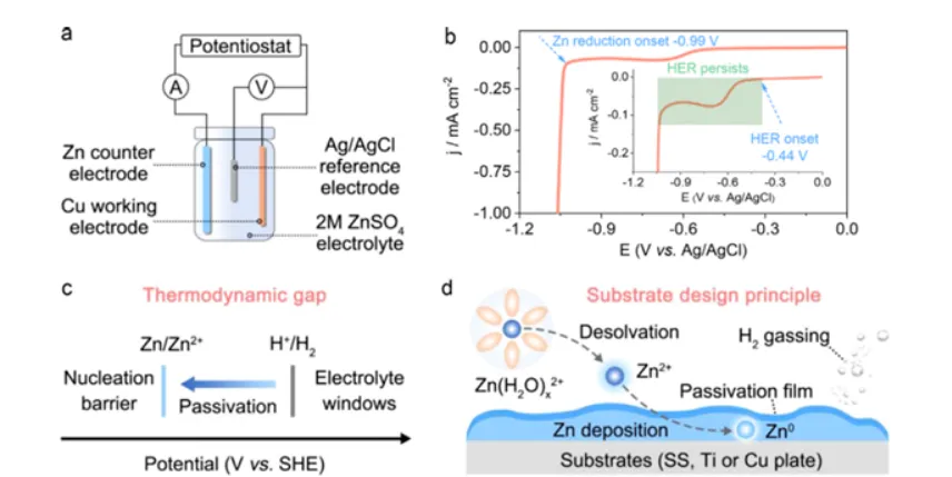 图1| HER与Zn还原的解耦电化学过程。(a) 用于电化学研究的三电极系统示意图。(b) 线性扫描伏安法(LSV)曲线包含了在2 M ZnSO₄电解液中同时存在的两个阴极反应(H₂/H⁺,Zn/Zn²⁺)。(c) HER与Zn/Zn²⁺氧化还原反应之间电势差的示意图,显示了热力学吉布斯能垒以及钝化层的形成。(d) 抑制HER动力学同时引导均匀Zn沉积的基底设计原则