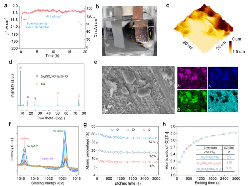 图2| Zn还原之前的H₂析出。(a) 在2 M ZnSO₄电解液中,在-0.99 V vs Ag/AgCl参比电极下的计时电流曲线。(b) Cu基底上吸附气体的光学照片。(c) Cu基底上ZSH生长的AFM图像。(e) 表面组分的SEM和元素分布图。(d) 计时电流测量后Cu基底的XRD图谱。(f) 计时电流测量后石墨电极表面组分的Zn 2p XPS光谱。(g) 通过刻蚀技术从XPS光谱中获得的片状结构中原子百分比(O、Zn和S元素)。(h) 随刻蚀时间变化的[O]/[Zn]原子比。插表列出了常见分解物种的[O]/[Zn]原子比,用于比较片状结构的组分分布