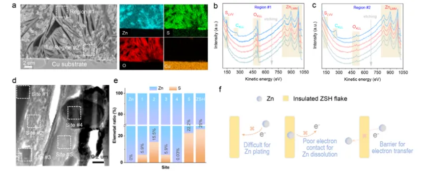 图3| Zn电沉积过程中Zn与ZSH的共生长现象。(a) Cu基底上Zn电沉积的横截面SEM图像及其对应的元素分布图。图中展示了两种代表性结构,分别是区域#1中的片状结构和区域#2中的散落结构。在50×50 nm范围内对两个代表性位置进行AES和深度剖面分析:(b)区域#1和(c)区域#2。(d) 对片状结构的STEM观察,该样品通过FIB技术获得。(e) STEM图像中五个不同随机位置对应的元素比(S元素与Zn元素之比)。元素比有两个极限:纯Zn(0% S)和纯ZSH组分(25% S)。(f) 层状ZSH生长以减少Zn晶体电子接触的示意图