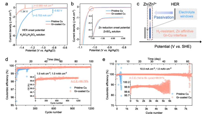图5| 抗H₂、Zn亲和性多功能界面的构建。在(a)K₂SO₄-H₂SO₄电解液和(b)2 M ZnSO₄电解液中,使用原始Cu或Gr包覆Cu基底的LSV极化曲线。(c) 不同亲和性下HER和Zn还原起始电位反转的示意图。在Cu和Gr包覆Cu基底上Zn镀层/剥离过程的效率。(d) 1.0 mA cm⁻²和1.0 mAh cm⁻²。(e) 10.0 mA cm⁻²和1.0 mAh cm⁻²