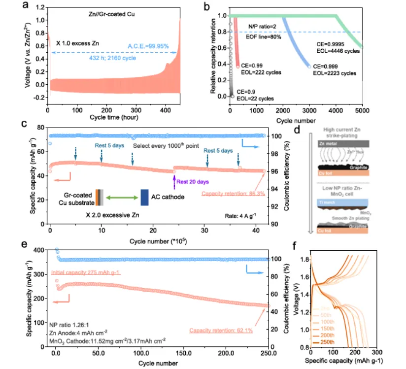 图6| 多功能界面提升Zn可逆性与循环寿命。(a) 根据Doron Aurbach测试方案,Gr包覆Cu基底上Zn镀层/剥离的平均效率。测试条件:20.0 mA cm⁻²,1倍过量Zn用量,重复镀层/剥离过程中截止电位为0.5 V。(b) 不同平均CE下N/P比为2时Zn基电池的理论循环寿命。(c) Zn//AC混合超级电容器的长期工作性能(0.2~1.8 V vs Zn/Zn²⁺)。测试条件:基于AC质量4 A g⁻¹,Gr包覆Cu基底上2倍过量Zn用量。(d) 有限Zn负极设计、高负载MnO₂的高能量密度Zn-MnO₂电池示意图。(e) N/P比为1.26的Zn-MnO₂电池的循环寿命。(f) 对应的电压-容量曲线