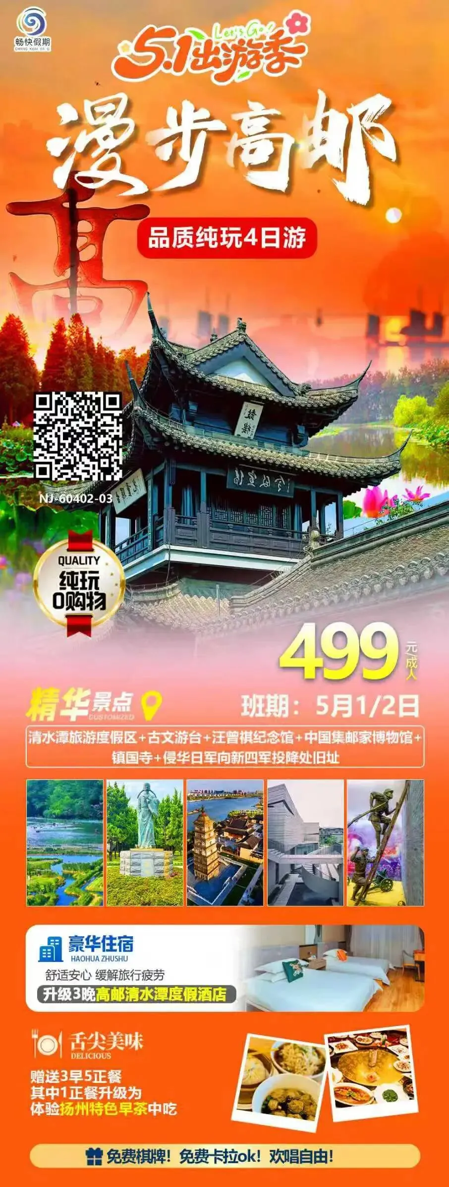 5月1号铁发有余位 5月2号铁发有余位 🔥五一高邮闭眼冲!499元纯玩康养4日游,全程0购物无套路! ✔️游玩:清水潭绿野仙踪(含单程小火车+游船)、古文游台、汪曾祺纪念馆、镇国寺、盂城驿、中国集邮家博物馆等全景点打卡,解锁千年邮城人文与自然秘境 ✔️福利:免费棋牌+免费卡拉OK,康养休闲双满足,老幼皆宜不无聊 ✔️加选:可解锁扬州一日游,打卡瘦西湖、东关街、三湾风景区网红地标 🥯美食:含3早5正餐,专属1正餐体验扬州特色早茶,烫干丝、鲜肉包、烧卖等淮扬味吃到爽 🏨住宿:升级3晚高邮清水潭度假酒店,推窗即览湖光山色,沉浸式湖居超惬意 💰 综合服务费100元/人,报名时收取 |