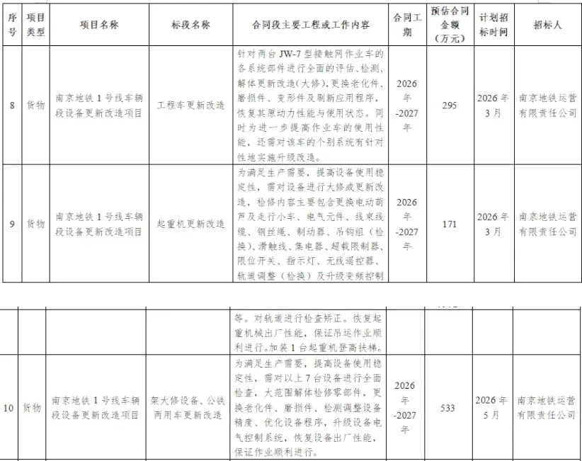 另外,根据今年3月份发布的计划表,南京地铁1号线机电系统设备更新改造项目(1号线机电系统风水电核心设备采购)的计划招标时间,也是2026年4月份。