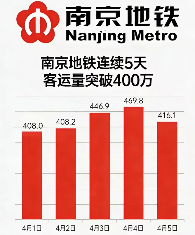 根据官方统计的数据,4月1日-5日南京地铁客流量每天都在400万以上,其中清明假期首日达到469.8万乘次,为历史次高纪录(仅次于2025年跨年夜533.1万)。