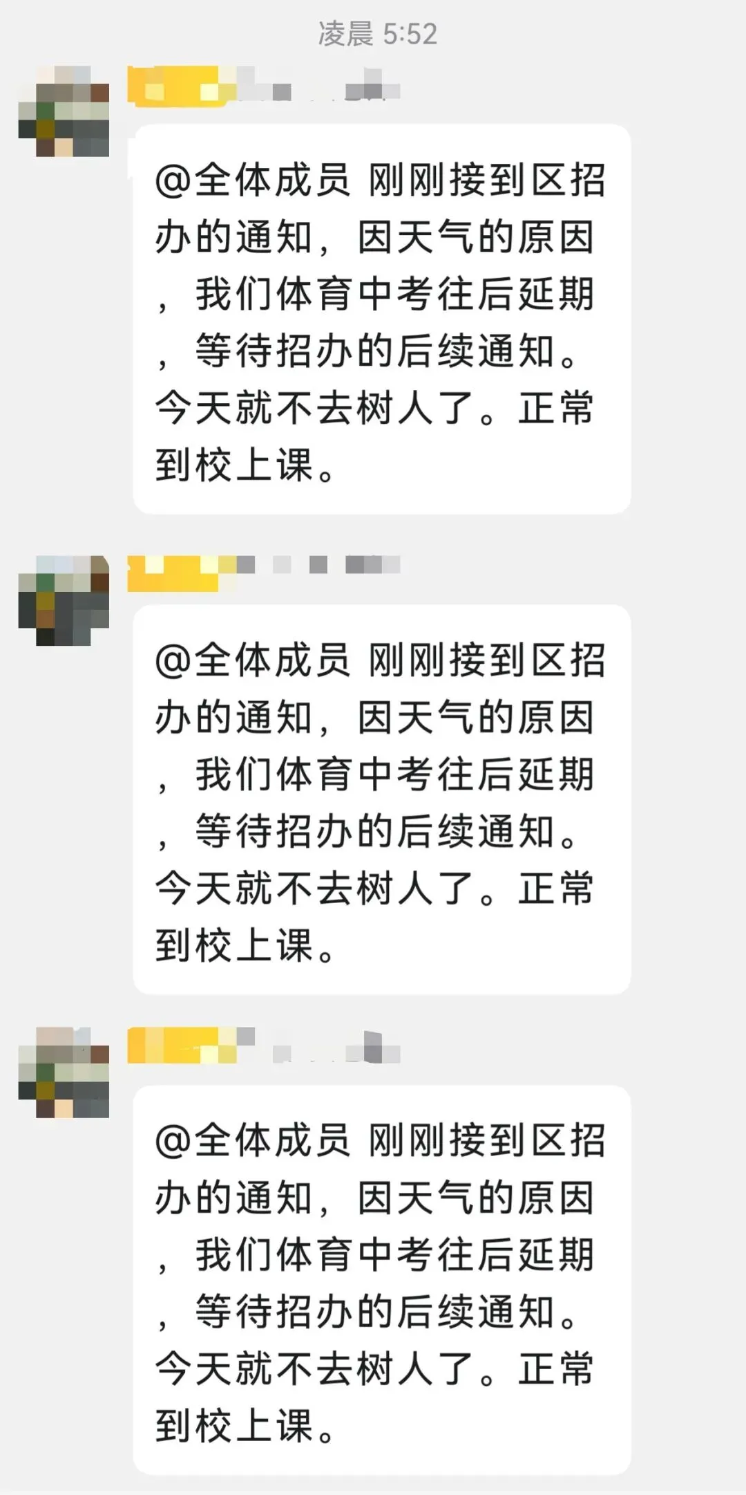 刚刚接到区招办的通知,因天气的原因,我们体育中考往后延期,等待招办的后续通知。今天就不去树人了。正常到校上课。