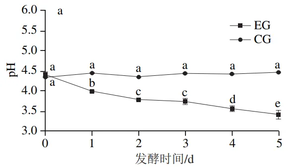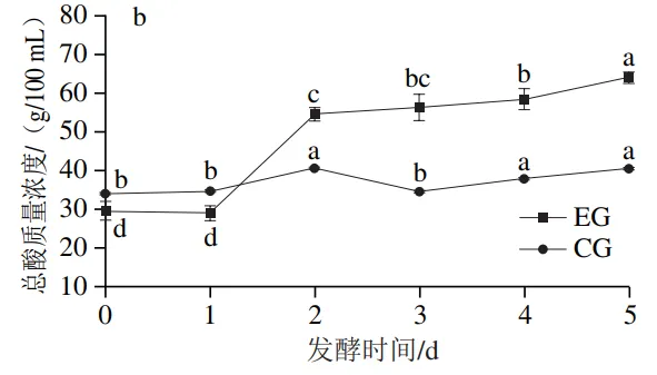 由图2a可以看出,随着发酵时间的延长,实验组的pH值逐渐降低,由4.40降至3.41,变化幅度较大;对照组的pH值最高为4.45,最低为4.35,pH值变化不显著。由图2b可以看出,实验组的总酸质量浓度随着发酵时间延长逐渐增加,由29.76 g/100 mL增加到64.14 g/100 mL,并且在发酵1~2 d显著增加,推测发酵前期醋酸菌为发酵主要菌群。对照组总酸质量浓度在34.10~42.58 g/100 mL之间波动,变化幅度相对于实验组来说较小。结合pH值与总酸含量变化可以看出,在红茶菌发酵过程中,由于微生物作用,会产生大量的酸,导致发酵液的pH值降低,也进一步影响发酵液的理化性质与感官品质。