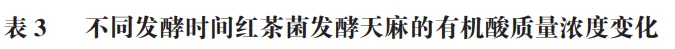 红茶菌中醋酸菌作为主要菌株之一,能够利用有机物产生大量乙酸,因此乙酸的质量浓度增长幅度较大。琥珀酸在发酵过程中也出现大幅度增长的情况,由于天麻本身含有琥珀酸,在微生物发酵的作用下,其质量浓度也逐渐升高。红茶菌中含有较多的葡萄糖醛酸,因此其在发酵初始阶段的含量较高,而在红茶菌发酵初期,微生物会利用葡萄糖醛酸中的糖基,因此,其含量随之降低。发酵液中乳酸、酒石酸、苹果酸等有机酸会改善发酵液的风味,增加发酵液的营养成分。