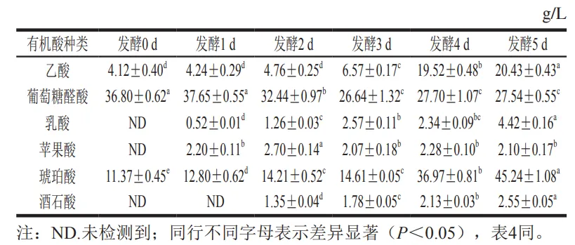 如表3所示,在发酵过程中,乙酸与琥珀酸质量浓度分别由4.12、11.37 g/L增长至20.43、45.24 g/L。与发酵前2 d相比,第3、4、5天的发酵液中乙酸含量显著提高(P<0.05),发酵5 d增长为原来的4.96 倍;琥珀酸质量浓度在发酵第5天达到最高值,为原来的3.98 倍;并且发酵第4、5天的含量显著高于发酵前3 d。其次是酒石酸和乳酸,发酵5 d酒石酸质量浓度增长了2.55 g/L,乳酸质量浓度增长了4.42 g/L。苹果酸在发酵过程中含量较稳定,质量浓度在2.07~2.70 g/L之间。葡萄糖醛酸作为一种大分子酸,其质量浓度在发酵过程中有所下降,由36.80 g/L下降至27.54 g/L,主要在发酵第1天和第3天之间变化显著,发酵3~5 d之间变化不显著。