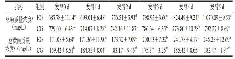 通过表4可知,实验组发酵1 d多酚质量浓度并没有发生显著变化,发酵2~5 d,不同发酵时间之间的多酚质量浓度均有显著差异(P<0.05),并且总酚质量浓度随着发酵时间的延长逐渐增加,由685.78 mg/L增加到1070.09 mg/L。对照组的总酚质量浓度在部分发酵时间之间也存在显著差异,总体来看,其总酚质量浓度在714.07~792.27 mg/L之间变化,变化幅度相对于实验组较小。黄酮质量浓度在发酵过程中变化明显。实验组发酵2~4 d,其黄酮质量浓度显著增加,发酵初始黄酮质量浓度为171.08 mg/L,发酵后达到最大值245.25 mg/L,增长74.17 mg/L;对照组的黄酮质量浓度总体变化不显著,发酵时间对黄酮质量浓度影响较小,最大值为184.83 mg/L,最小值为169.42 mg/L。